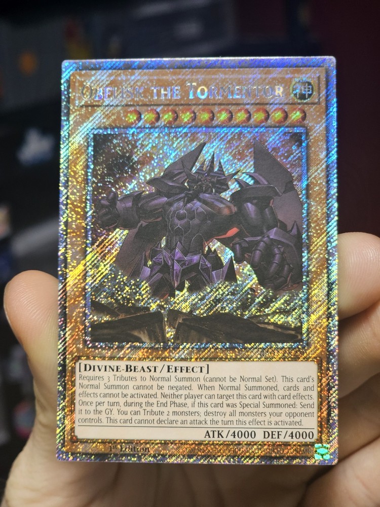 The product is a Platinum Secret Rare Yu-Gi-Oh! TCG card featuring Obelisk the Tormentor from the Quarter Century Bonanza set. Part of the Dark attribute, this card belongs to the Warrior, Fiend, Spellcaster, and Dragon creature types. Manufactured in 2024 by Konami, it is in English language with a holo finish. This collectible card is aimed at players aged 6 and up, adding to their collection of Yu-Gi-Oh! cards featuring characters like Yami Yugi and Seto Kaiba.