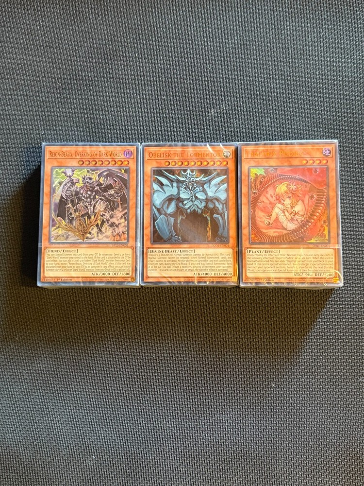 3 Yu-Gi-Oh! TCG Structure Decks: Dark World, Obelisk the Tormentor, Beware the Traptrix Darkness returns this winter with the brand-new Structure Deck: Dark World! Grapha, Dragon Lord of Dark World first debuted in the game-shaking Structure Deck: Gates of the Underworld and its return is now nigh! Structure Deck: Dark World brings this notorious theme back to the human world with a slew of new features! Here’s just some what you can expect: Reign-Beaux, Overlord of Dark World has received a promotion! This new form of Reign-Beaux Level 8 monster with 3000 ATK can Special Summon itself from the Graveyard (GY) simply by returning a Level 7 or lower “Dark World” monster from your field to your hand. If it is discarded to the GY, you can add a Level 5 or higher “Dark World” monster from your Deck to your hand, and if it was your opponent who forced you to discard, watch out… Reign-Beaux isn’t the only one who’s been waiting for this day for over a decade! The great dragon lord Grapha has a brand-new form as well! The new Grapha is a Fusion Monster Summoned using Grapha, Dragon Lord of Dark World and any other DARK monster. You can Summon it with a new Spell Card that lets you Fusion Summon by discarding cards, triggering the effects of any “Dark World” monsters used as well as other powerful DARK monsters like the “Danger!” monsters. While this new Fusion Monster is on the field, you can hijack an opponent’s Normal Spell/Trap Card or monster effect, turning it into a discard effect that unleashes your “Dark World” monsters’ true power! This new Structure Deck is playable right out of the box – the Dark World army awaits you! Obelisk the Tormentor! Unleash the true power of Obelisk the Tormentor by Tributing 2 monsters you control and wipe your opponent’s monsters off the field! This Deck uses self-replicating monsters to provide Tributes and protect your Life Points as you get closer to drawing your Divine Beast. Obelisk’s own ability can crush your opponent’s monsters all at once, but throw in the new Spell Card, Fist of Fate, and you can negate a monster’s effect and destroy it without needing to Tribute. Activate during your own Main Phase and you can crush all your opponent’s Spells and Traps as well! Watch your step, the footing is treacherous and full of “Trap Holes” in Structure Deck: Beware of Traptrix! The popular “Traptrix” strategy from Yu-Gi-Oh! MASTER DUEL now has its own Yu-Gi-Oh! TRADING CARD GAME Structure Deck! The “Traptrix” theme is comprised of EARTH Plant and Insect-Type monsters that may appear cute on the surface, but the closer you get the more you’ll find that they’re truly nefarious. This strategy revolves around “Traptrix” monsters that help you Set powerful “Trap Hole” Trap Cards that can drop your opponent’s monsters right out of the Duel! In this Structure Deck you’ll find key “Traptrix” and “Trap Hole” cards from the past alongside powerful brand-new cards! ***COMBINED SHIPPING AVAILABLE***