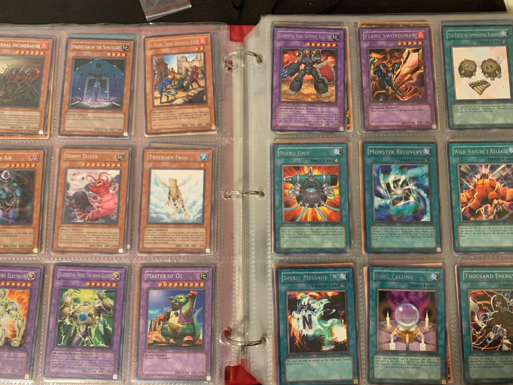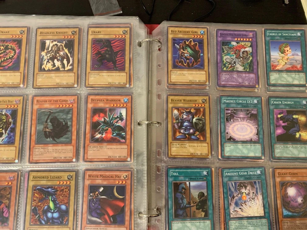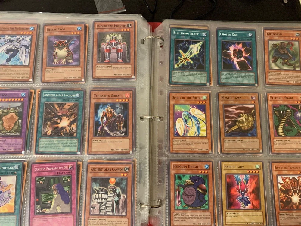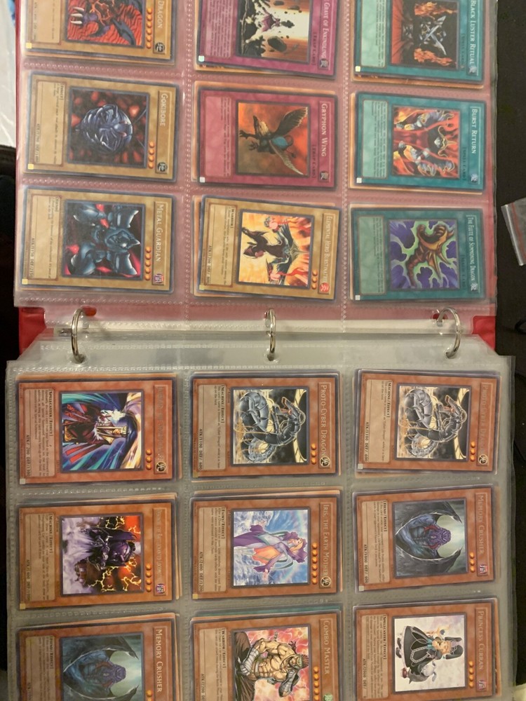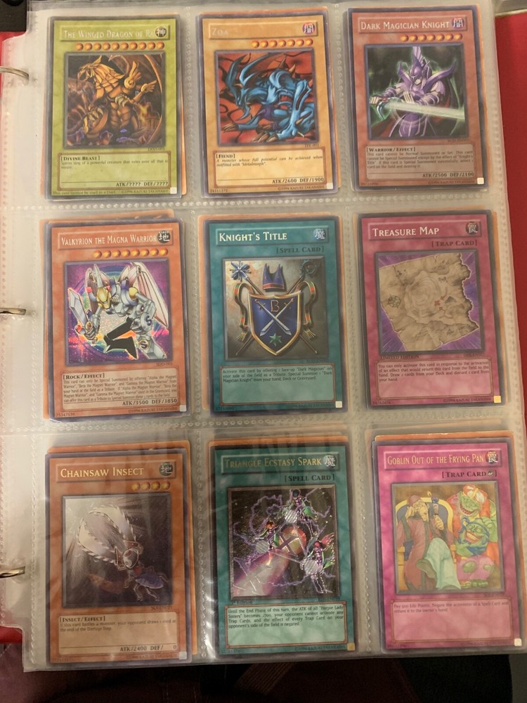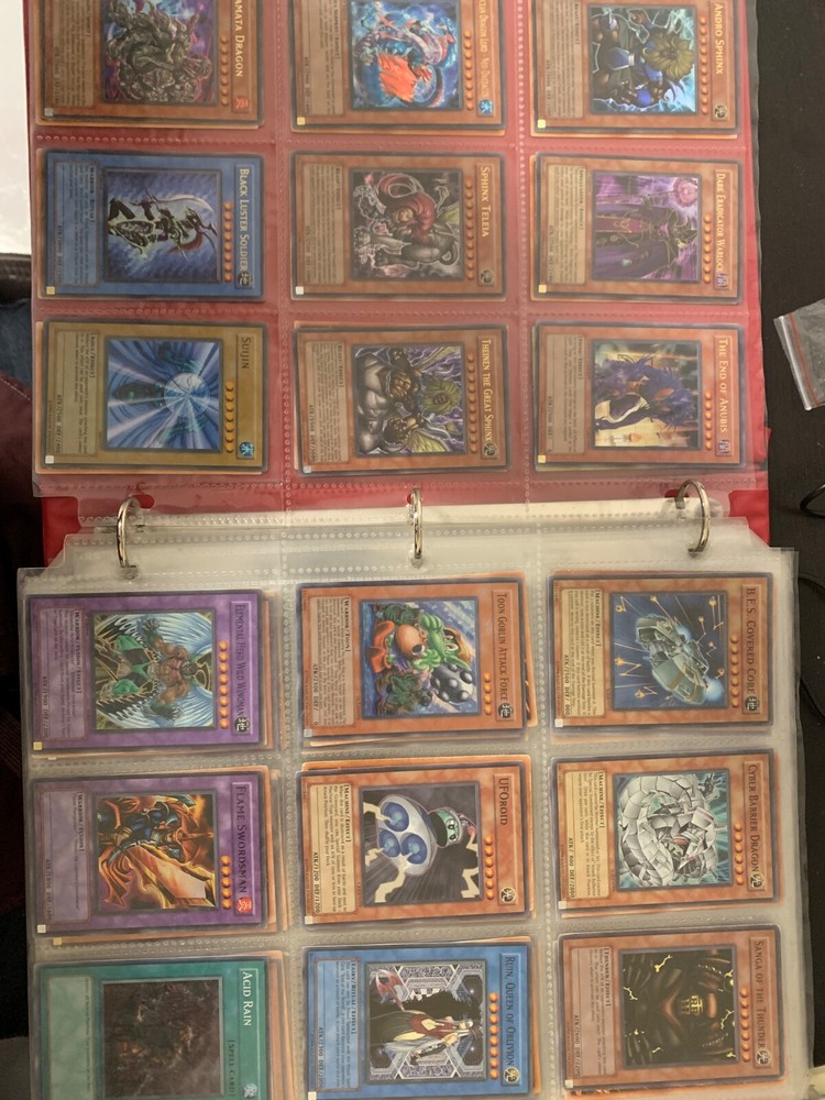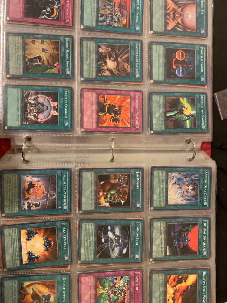 This Yu-Gi-Oh! TCG card lot includes over 400 cards, featuring vintage sets from the first sets up to around the GX era of the series. Cards are stored in sheets and come in a binder. Most cards are near mint, some are lightly played, and very few are worse. Several cards are not pictured. I’m including a Winged Dragon of Ra promo card in played condition. Some sets (from memory) include: Enemy of Justice Shadow of Infinity Elemental Energy Cyberdark Impact Power of the Duelist Cybernetic Revolution The Lost Millenium There are very few duplicates.