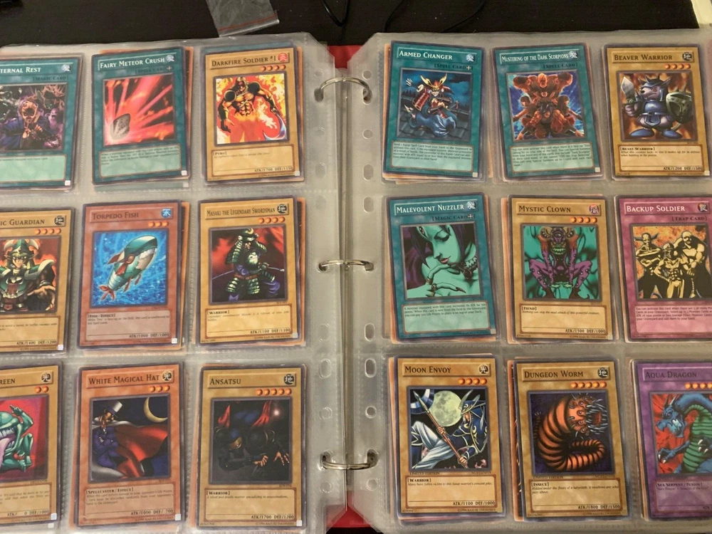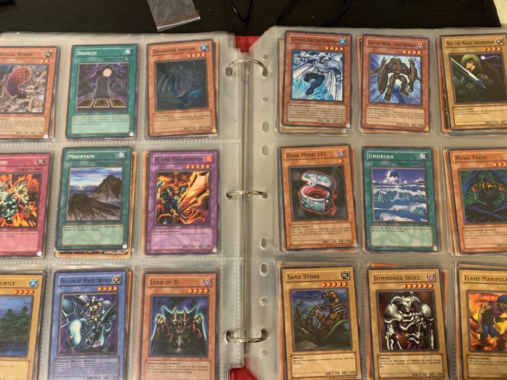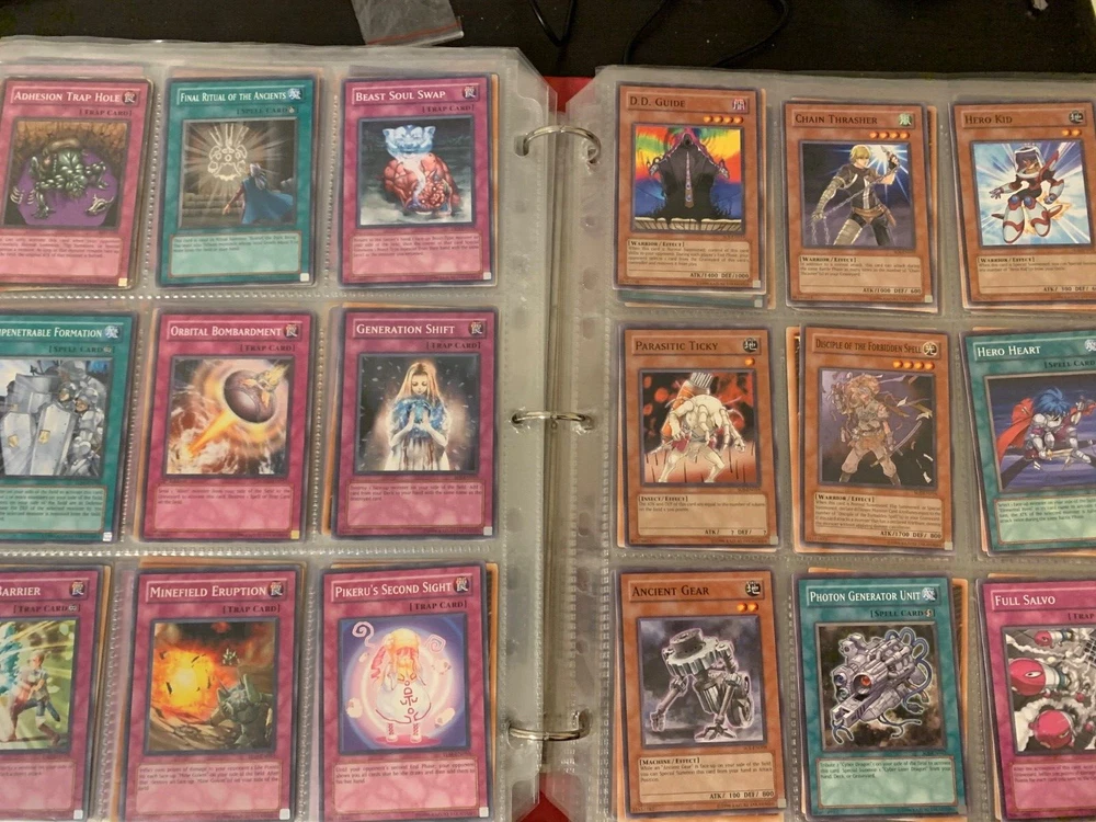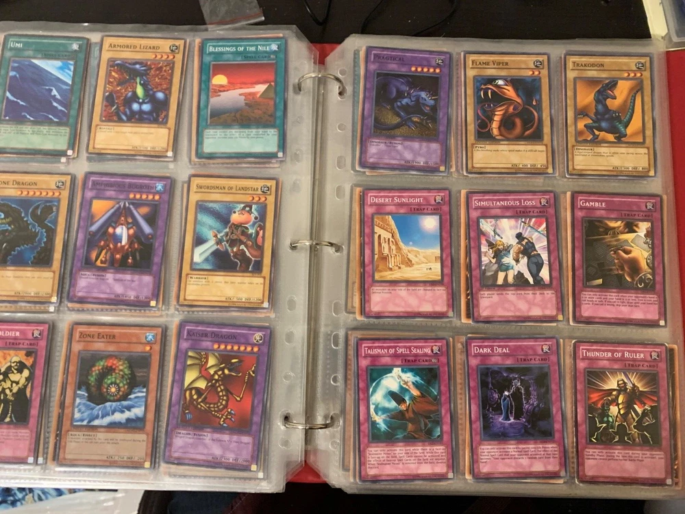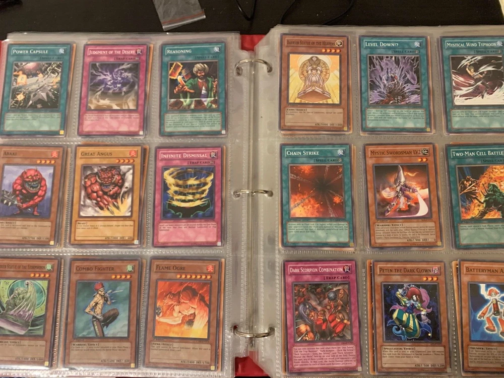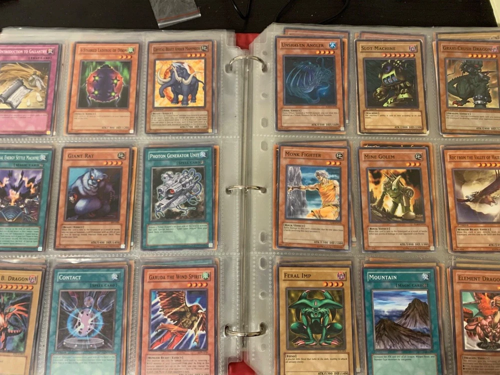 This Yu-Gi-Oh! TCG card lot includes over 400 cards, featuring vintage sets from the first sets up to around the GX era of the series. Cards are stored in sheets and come in a binder. Most cards are near mint, some are lightly played, and very few are worse. Several cards are not pictured. I’m including a Winged Dragon of Ra promo card in played condition. Some sets (from memory) include: Enemy of Justice Shadow of Infinity Elemental Energy Cyberdark Impact Power of the Duelist Cybernetic Revolution The Lost Millenium There are very few duplicates.