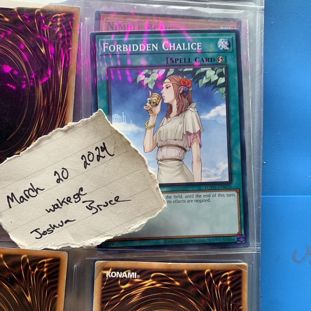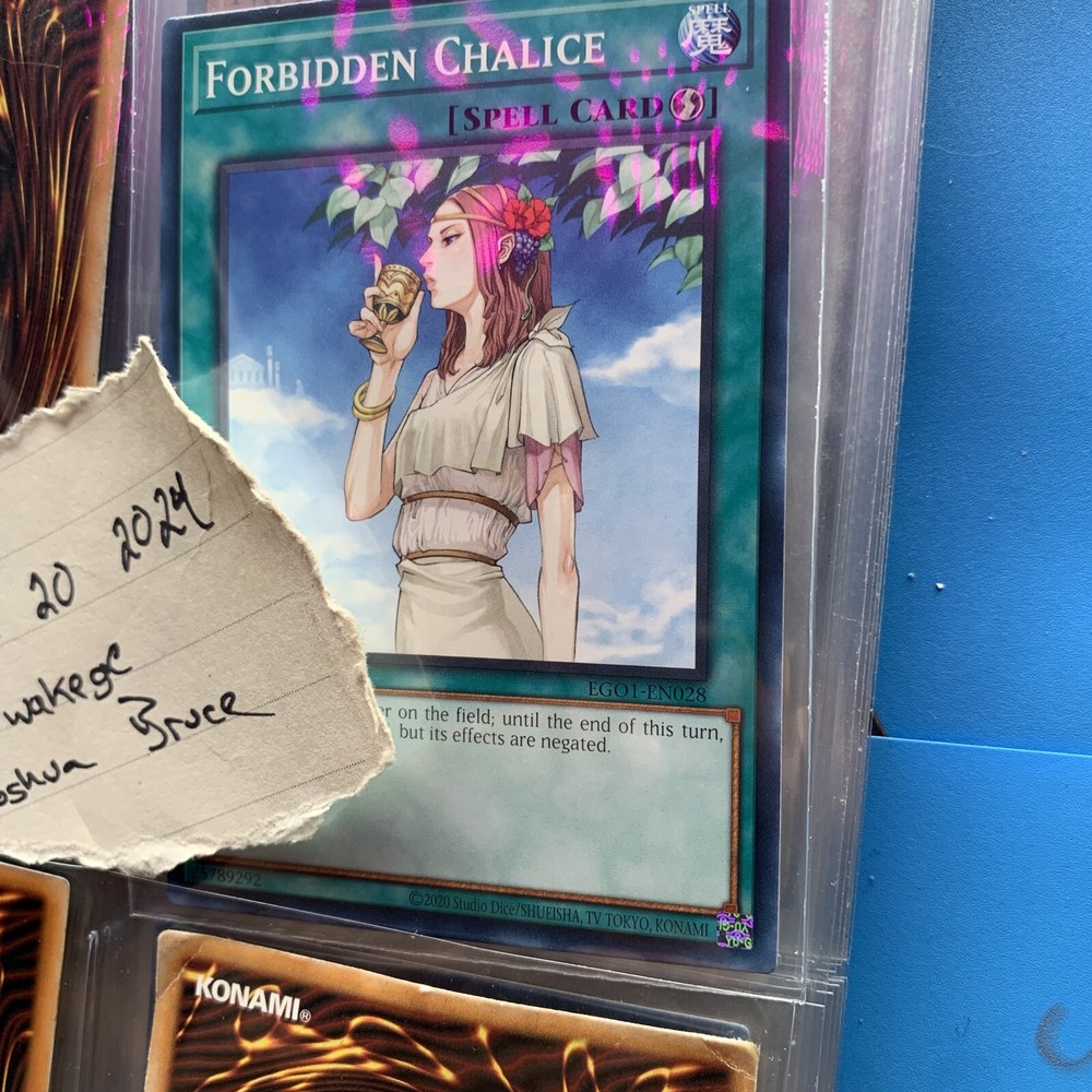 This Yu-Gi-Oh! TCG card is a rare find for collectors of the Egyptian God Deck: Obelisk the Tormentor set. The Forbidden Chalice Spell card is a 1st Edition and in near mint or better condition. It is perfect for those who are looking to complete their collection or add to their deck. The card number is EGO1-EN028 and it is classified as a common card. This card is a great addition to any game of Yu-Gi-Oh! TCG and is sure to bring excitement to your matches. Don't miss out on the opportunity to own this rare card. Sleeve included.