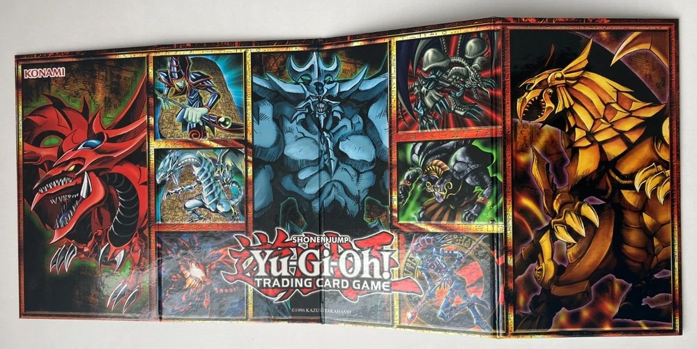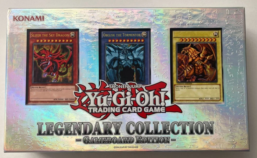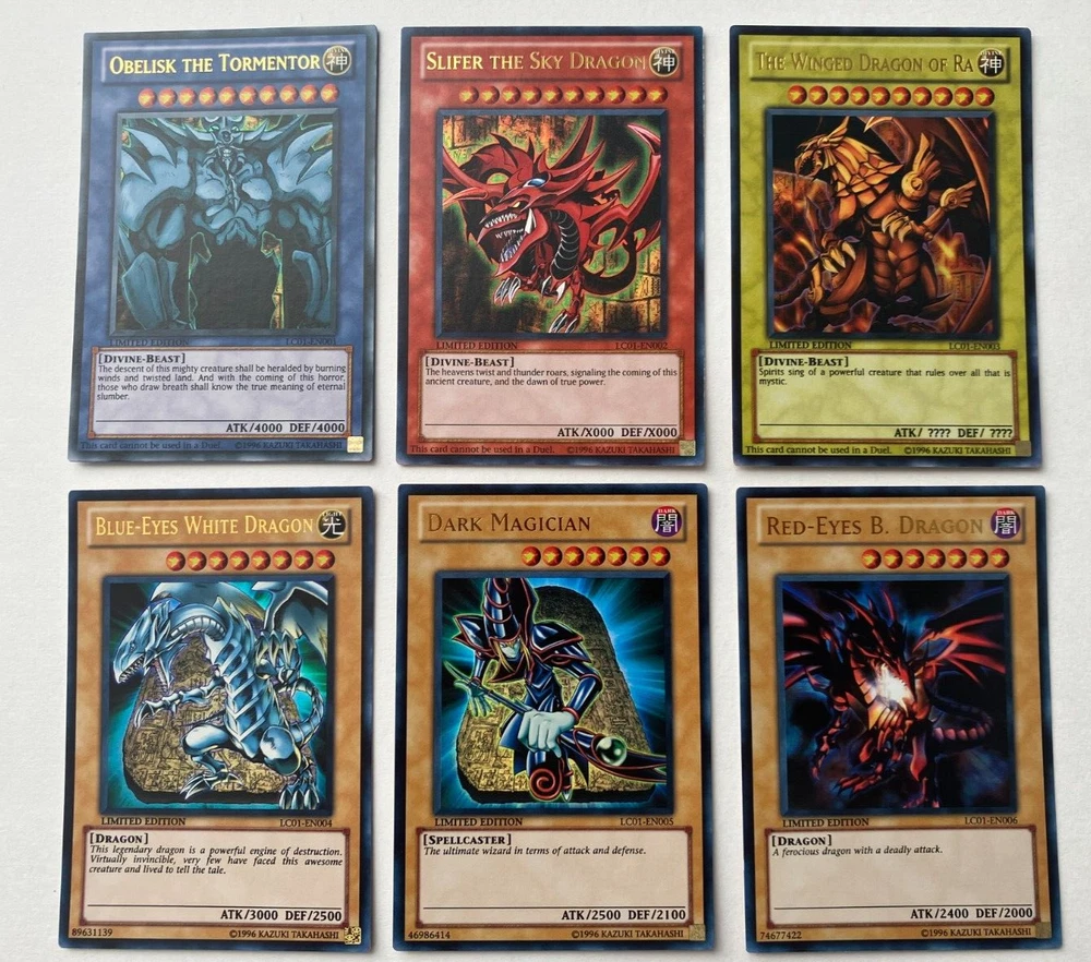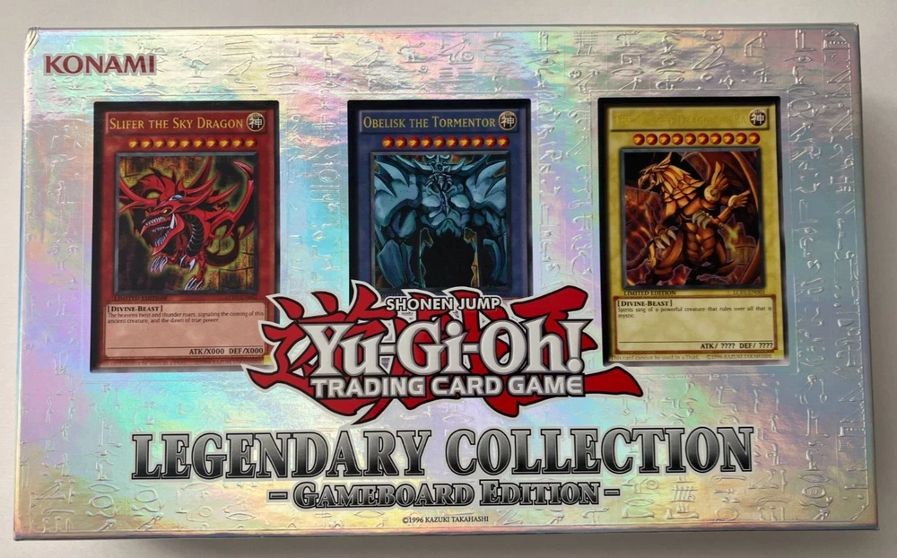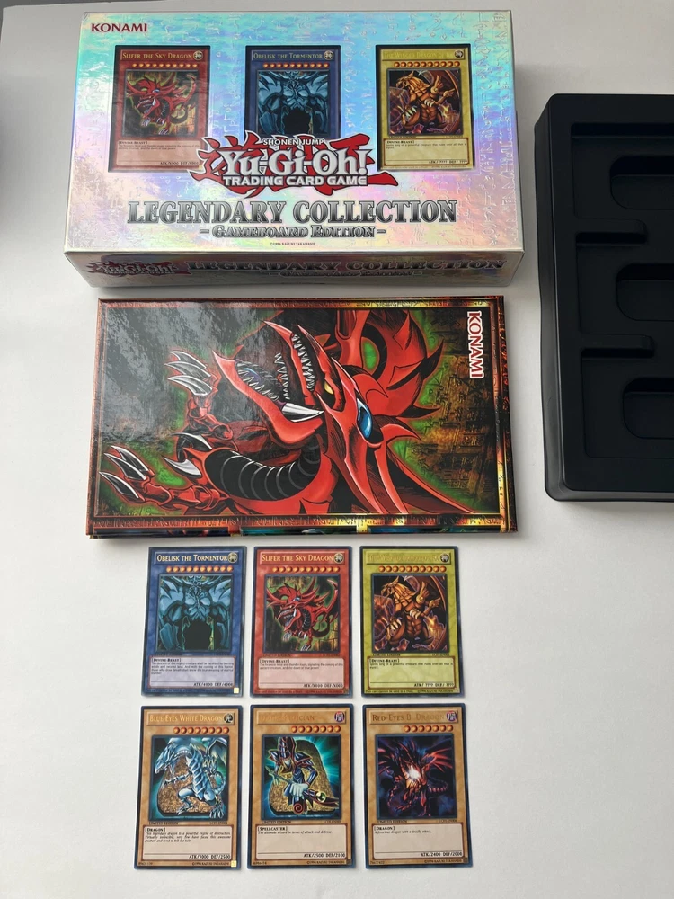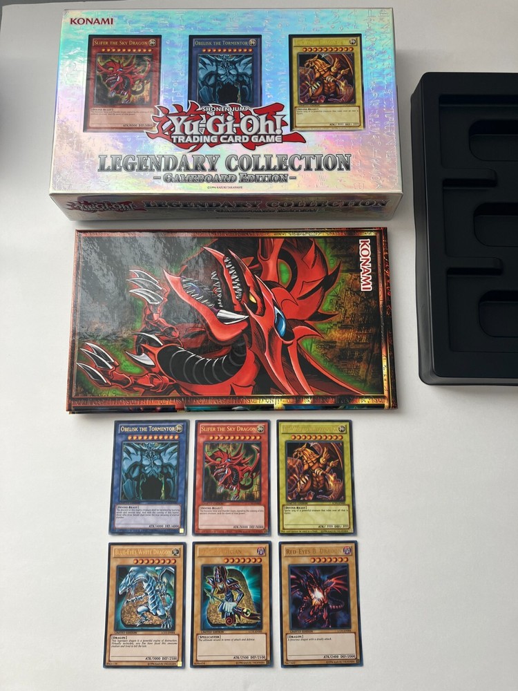 Yu-Gi-Oh! TCG - Legendary Collection: Gameboard Edition 2013 This lot includes one box, one hard double-sided game board, and six promotional cards. The following cards are included and their conditions: LC01-EN001 "Obelisk the Tormentor" Ultra Rare Monster Card - NM LC01-EN002 "Slifer the Sky Dragon" Ultra Rare Monster Card - LP+ LC01-EN003 "The Winged Dragon of Ra" Ultra Rare Monster Card - NM LC01-EN004 "Blue-Eyes White Dragon" Ultra Rare Normal Monster - NM LC01-EN005 "Dark Magician" Ultra Rare Normal Monster - NM LC01-EN006 "Red-Eyes B. Dragon Ultra Rare Normal Monster - NM