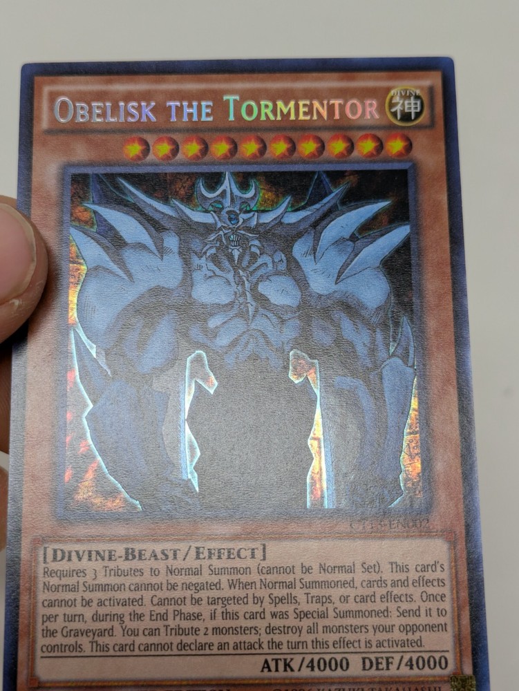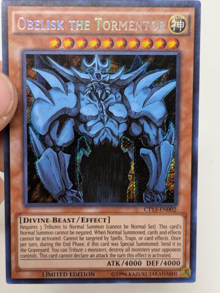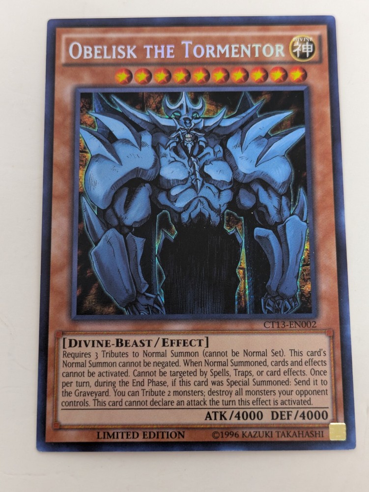 Yu-Gi-Oh TCG Obelisk The Tormentor CT13-EN002 Limited Edition Secret Rare NM Comes in NM See pictures for details Shop with confidence, we accept free returns up to 30 days! 1.All items are cleaned & tested before being posted and listed Unless Otherwise Specified in Title or Description 2.We ship items with a same day/ 1 day business day processing time! 3.We ship standard shipping with Stallion Express We do Consolidated shipping upon request! 4.We DO NOT, ship to PO Box's,& Northwest/Yukon Territories and reserve the right to cancel an order if we see fit. Please contact me before hand if you have a PO box and want to work something out. 5.If for some reason this item is not right for you, please contact me before sending item back, or leaving Neutral or Negative feedback. I am open to resolving any problem! 6.If you have any questions about this product or any other product, feel free to send me a message. Thank you soo very much for considering our store.