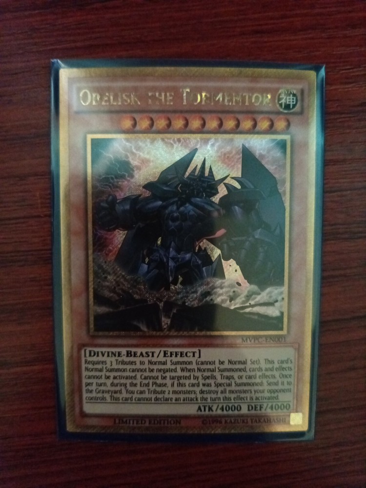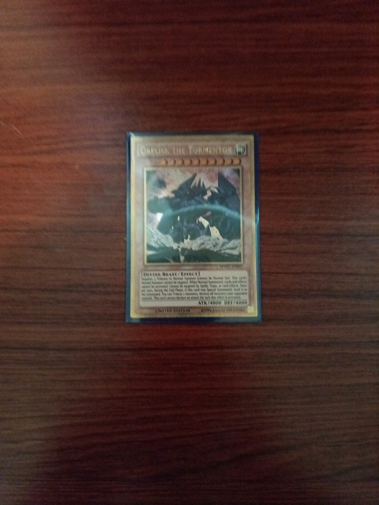 The Obelisk The Tormentor card is sure to be a standout addition to your collection. This card is an alternative Gold Secret Rare from the Yu-Gi-Oh Dark Sides of Dimension movie pack. This promo card is limited edition and a perfect addition to any collection and is a must have for any collection. One of three Egyptian God cards, as mighty as it comes.