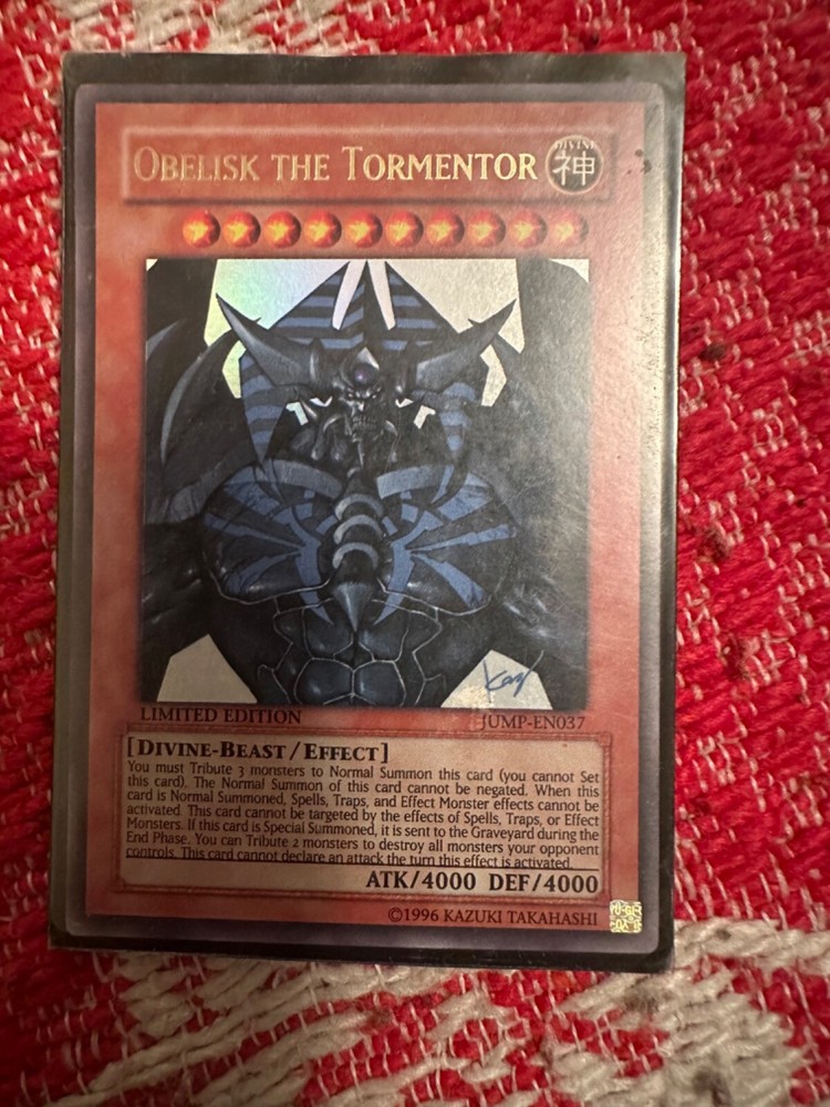 This limited edition Yu-Gi-Oh! TCG card features Obelisk the Tormentor (Alternate Art) with a Divine-Beast monster type, 4000 ATK/DEF power, and a Prismatic Secret Rare rarity. It is part of the 2019 Gold Sarcophagus TiN set and has the card number Tn19-En007. Perfect for any collector or player, this Effect card is a must-have addition to your deck. It's powerful and visually stunning, making it a standout choice for any game. Don't miss your chance to add this rare and highly sought-after card to your collection!