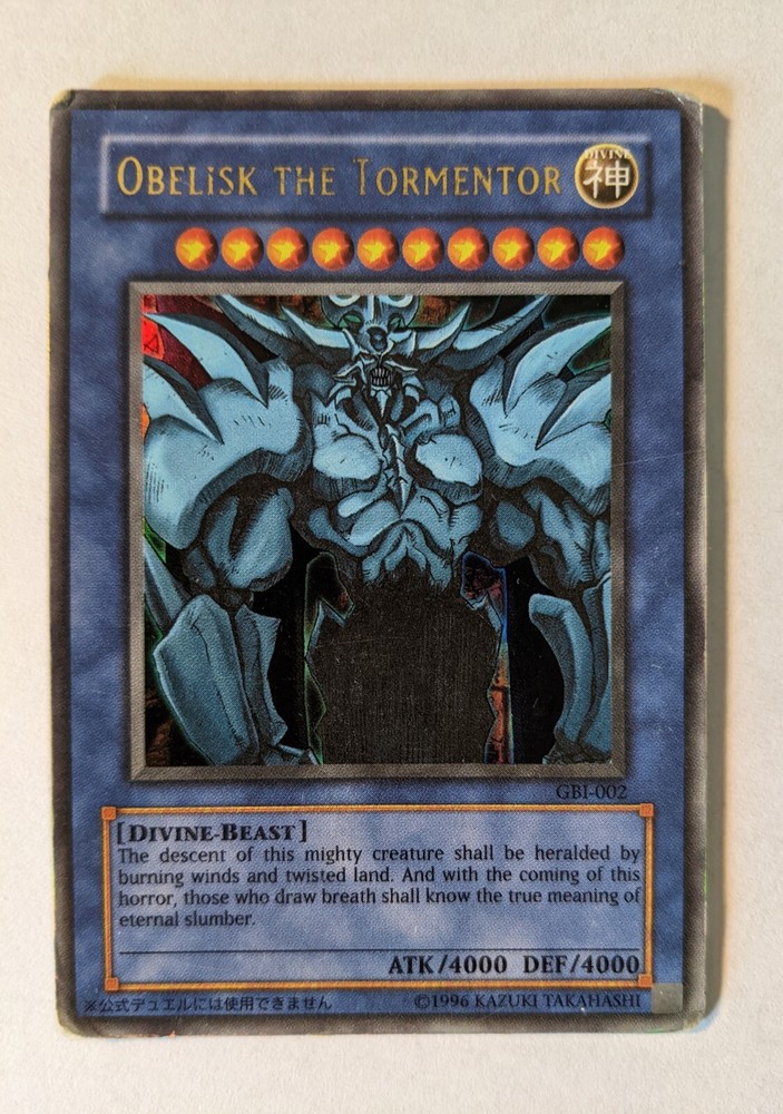 Yu-Gi-Oh! TCG Obelisk the Tormentor GBI-002 Secret Rare/MP (See description) Number: GBI-002 Rarity: Secret Rare/Unlimited Condition: Moderately Played (MP) Imperfection types: Edgewear, specifically on the four corners and mostly on the back of the card's corners. Other details: Background is holographic and gold shiny letters Packaging: Will be sent in bubbled envelop with a protective sleeve and other measures to ensure no bending etc. during shipping. Reason for selling: Had my cards I collected as a kid that I no longer play after going through my childhood stuff. Hoping someone who appreciates Yu-Gi-Oh cards from the first generation can enjoy this now, even if now as an adult! Been a learning experience going through my cards and selling them.