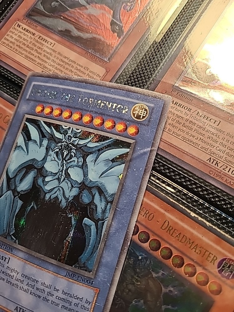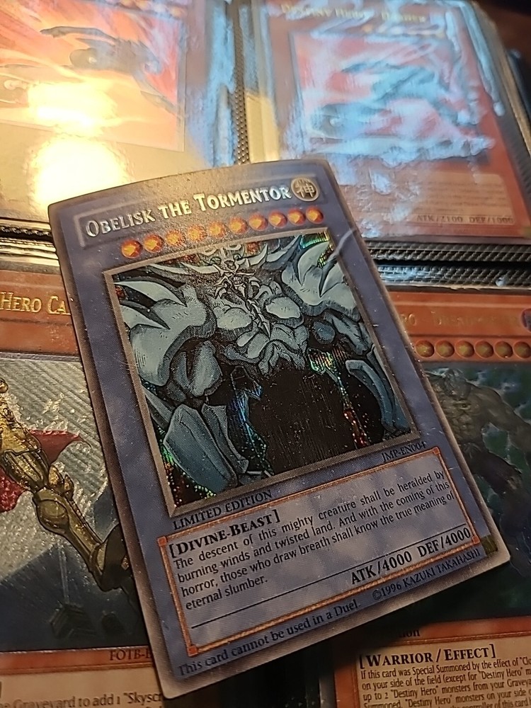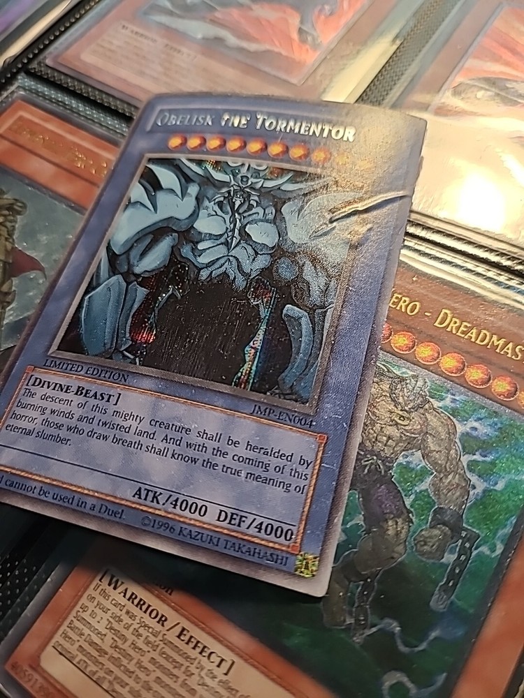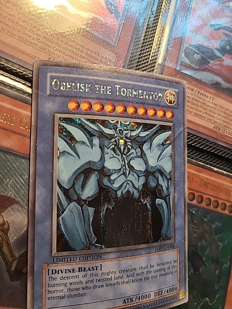 For all Yu-Gi-Oh! fans, we present the limited edition Shonen Jump Promo Obelisk the Tormentor card (JMP-EN004). This card features Yami Yugi, Yugi Muto, and a box with a divine-beast monster type. With 4000 attack and defense, this secret rare card is moderately played and in very good condition.