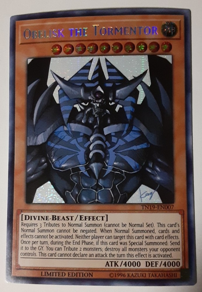 Own the power of the divine with this limited edition Obelisk the Tormentor card from the 2019 Gold Sarcophagus Tin set of the Yu-Gi-Oh! TCG. This prismatic secret rare card features an alternate art design of the mighty Divine-Beast monster with an impressive attack and defense of 4000 each. Add this highly sought-after card to your collection and dominate your opponents with its powerful effect. Perfect for serious collectors and avid players alike, this Tn19-En007 card is a must-have for any Yu-Gi-Oh! fan.