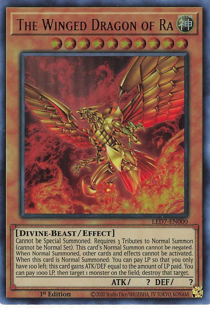 You are purchasing a Yu-Gi-Oh! TCG Legendary Duelists: Rage of Ra The Winged Dragon of Ra #LED7-EN000 Alt Art 1st Edition . Set: Legendary Duelists: Rage of Ra Character: The Winged Dragon of Ra Grade: Near Mint or Better Securely shipped via USPS. You will receive the exact item in the photographs. Thank you for looking. Note: Occasionally, vertical streaks will appear on an image. These are artifacts from the scanning process and the streaks are not on the actual card. Please ask for more photos if you have any concerns. Listed With Mascot .