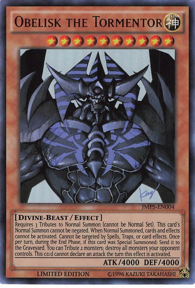 You are purchasing a Yu-Gi-Oh! TCG Shonen Jump Obelisk the Tormentor #JMP-EN004 Limited Edition . Set: Shonen Jump Character: Obelisk the Tormentor Grade: Near Mint or Better Securely shipped via USPS. You will receive the exact item in the photographs. Thank you for looking. Note: Occasionally, vertical streaks will appear on an image. These are artifacts from the scanning process and the streaks are not on the actual card. Please ask for more photos if you have any concerns. Listed With Mascot .