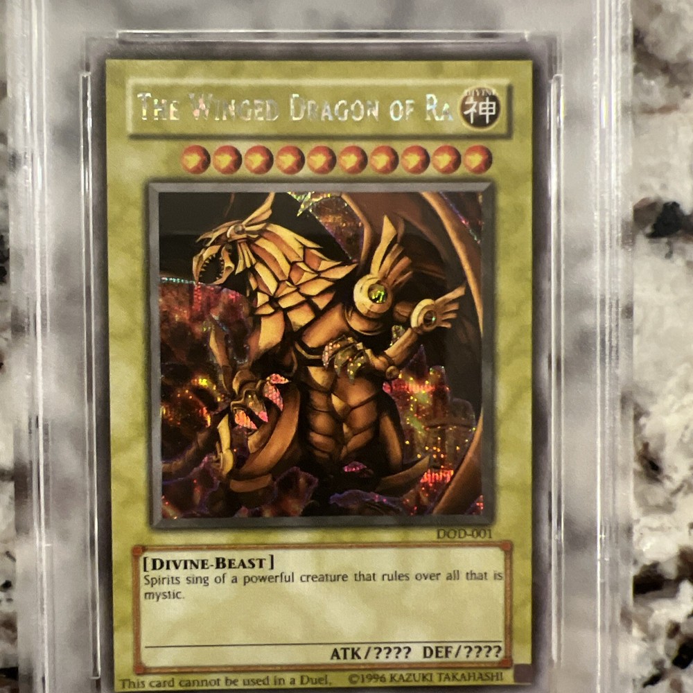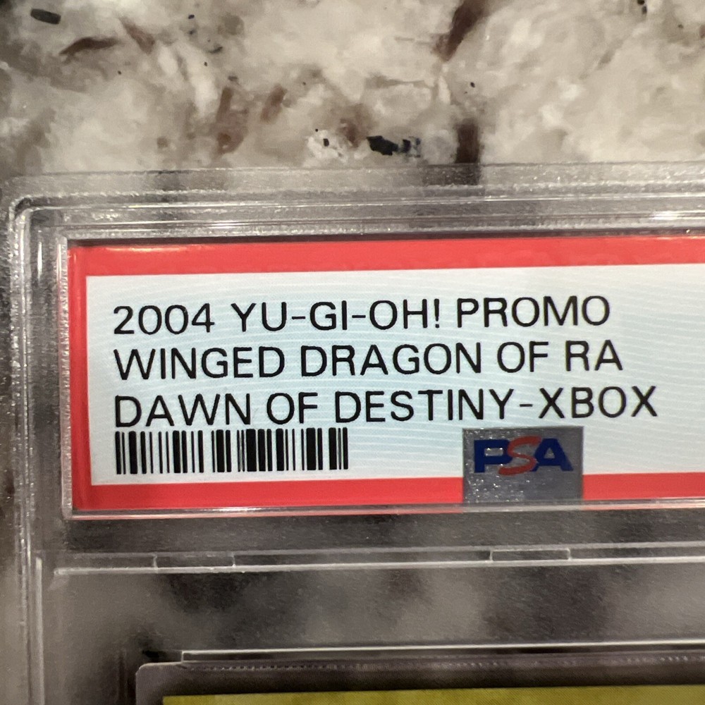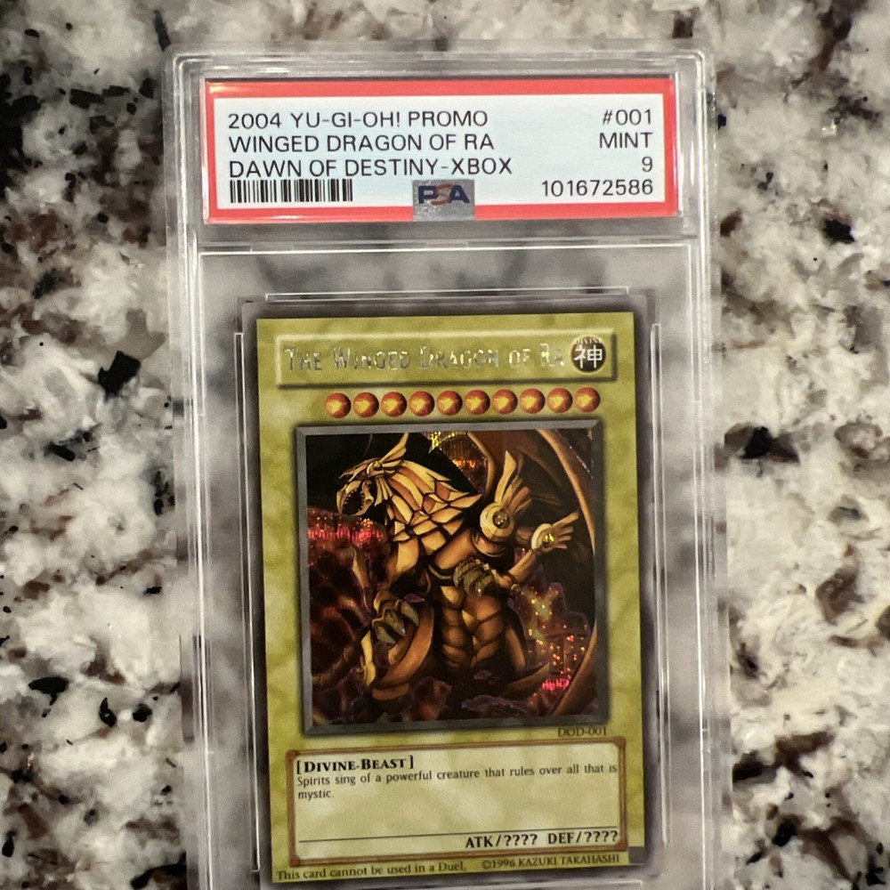 Elevate your Yu-Gi-Oh! TCG collection with the majestic "Winged Dragon of Ra" from the exclusive Dawn of Destiny Promotional Cards set. This Secret Rare gem, card number DOD-001, boasts a stunning foil finish that captures the essence of its powerful, mythological theme. Dawn, The Winged Dragon of Ra, takes center stage in this limited edition promo card, crafted by Konami to be a standout piece. Graded by the Professional Sports Authenticator (PSA) with an impressive score of 9, this card exemplifies quality and collectibility. Its limited edition status and promo features make it a sought-after item for both players and collectors alike. Add this exquisite piece to your arsenal and enjoy the prestige it brings to your collection.