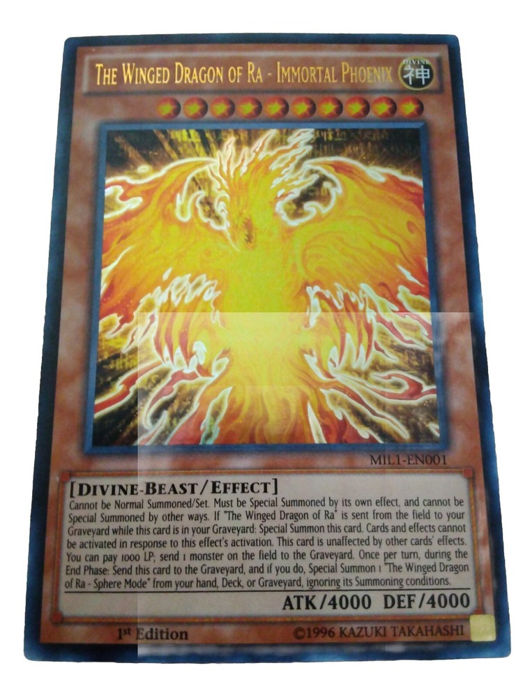 The winged dragon of ra immortal Phoenix must be summoned by the winged dragon of ra sent in the graveyard from the battle and you can special summoned this card from your hand and this card is destroyed by battle you can special summoned out the winged dragon of ra sphere mode from your hand or your deck or in the graveyard and this card is in very great shape and this card is 1st edition.