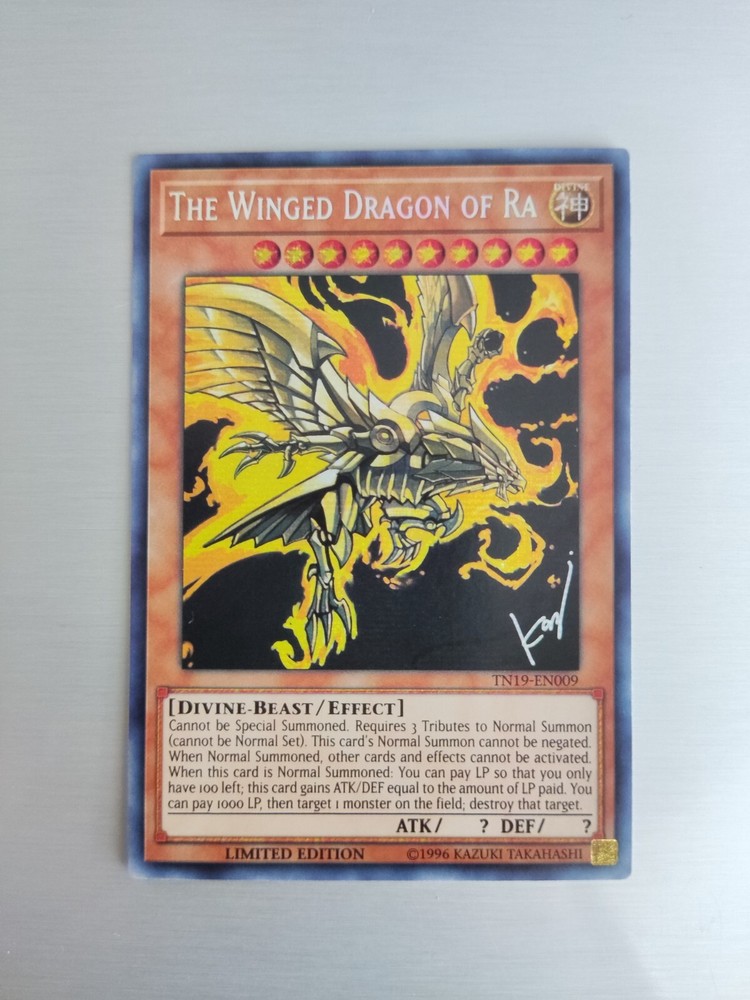 INFORMATION Yu-Gi-Oh! The Winged Dragon Of Ra TN19-EN009 Limited Edition Prismatic Secret Rare ... Condition is "Used" Near Mint. If you need more photos of the item, feel free to contact us. SHIPPING & DELIVERY Shipped in PWE if ( Under $20 orders ) Shipped with USPS First Class . Tracking included. ( Above $20 orders ) Priority Mail Is for graded cards, but you can request the First Class option instead. We will dispatch your item within 24 hours if possible. If not it will be within 2-3 business days of payment confirmation. ITEM PACKAGING / CARD CONDITION Your Item will be protected inside a sleeve, Top loader, Team Bag and within a Bubble Mailer. / Near Mint / Cards in Near Mint (NM) condition show minimal wear from shuffling, play or handling and can have a nearly unmarked surface, corners and unblemished edges outside of a few slight flaws. A Near Mint card may have slight edge wear or a scratch or three, but overall look nearly unplayed with no major defects. The acceptable range of cards within the Near Mint condition includes both cards with no imperfections and cards with a few slight imperfections. / Lightly Played / Cards in Lightly Played (LP) condition may have minor border or corner wear, scuffs or scratches. There are no major defects such as grime, bends or issues with the structural integrity of the card. Noticeable imperfections are okay, but none should be too severe or at too high a volume. The acceptable range of cards within the Lightly Played condition includes both cards with few or a handful of minor imperfections. / Moderately Played / Cards in Moderately Played (MP) condition can have border wear, corner wear, scratching or scuffing, creases or whitening or any combination of moderate examples of these flaws. A Moderately Played card may have some form of imperfection impacting a small area of the card from mishandling or poor storage, such as creasing that doesn't affect card integrity, in combination with other issues such as scratches, scuffs or border/edge wear. DEAR CUSTOMERS If you were happy with your purchase, please leave us a positive feedback and don't forget to introduce us to your friends! Please contact us if your item didn't arrive.