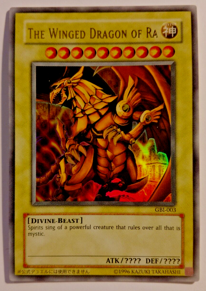 Yu-Gi-Oh! - The Winged Dragon of Ra - GBI-003 - Holo Ultra Rare - Englisch - Sammelkarte - gebraucht, Original, geöffnet, genutzt bzw. nicht eingeschweißt, verpackt Marke: Yu-Gi-Oh! - Nr.: GBI-003 - Typ: Divine-Beast - Stufe: Divine - Sprache: Englisch - ATK: ???? - DEF: ???? - Größe: Standard - Material: Pappe - Oberfläche: Holo - Seltenheit: Ultra Rare - Anzahl Sterne: 10 Sterne Inhalt: 1 Sammelkarte Der Artikel wird wie abgebildet versendet. Der Artikel ist eine Gebrauchtware, Original, geöffnet, genutzt bzw. nicht eingeschweißt, verpackt. Der Artikel weist geringe Gebrauchsspuren auf und ist in einem guten Zustand.