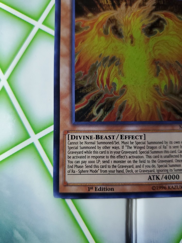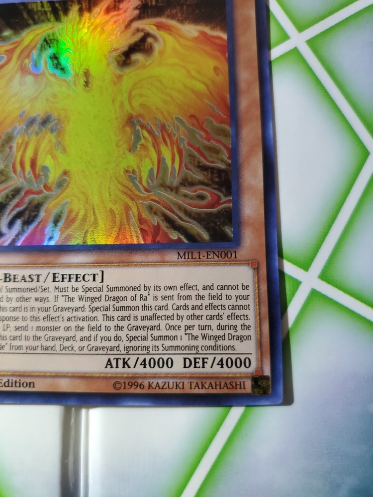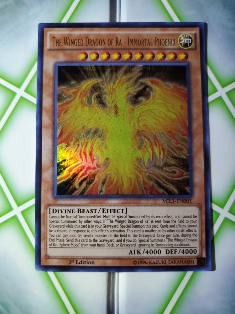 This Yu-Gi-Oh! card features The Winged Dragon of Ra - Immortal Phoenix, a Divine-Beast monster with 4000 attack and defense points. It is from the Millennium Pack set, is an Ultra Rare card, and has a holo finish. The card is in near mint or better condition, and is ungraded. The card's effect type is also mentioned, as well as its card number (MIL1-EN001), language (English), game (Yu-Gi-Oh! TCG), manufacturer (Konami), and features (1st edition). It is a great addition to any collection and is perfect for fans of the Yu-Gi-Oh! franchise.