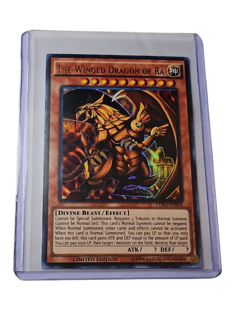 The product is a rare Yu-Gi-Oh! Trading Card Game card from the set "Yugi" featuring the legendary card "Slifer." This limited edition card is numbered 002 and is a highly sought-after collectible for fans of the game. With its unique artwork and exclusive features, the Yu-Gi-Oh! The Winged Dragon of Ra LDK2-ENS03 Ultra Rare Limited Edition card is a valuable addition to any collector's deck.