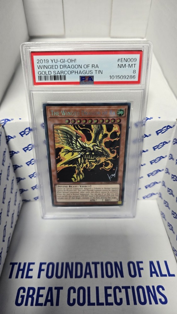 Elevate your Yu-Gi-Oh! TCG collection with the legendary The Winged Dragon of Ra card, a Secret Rare gem from the iconic -Yugi- set. This card is not only a powerful effect type monster but also a collectible piece that shimmers with its Holo finish. As a limited edition release, it holds a special place in the eyes of collectors and players alike. Graded by the Professional Sports Authenticator (PSA) with a commendable score of 8, this card is a testament to its quality and preservation. Note that this card is not autographed, ensuring its authenticity as a purely Konami-crafted collectible. Add divine power to your deck and cherish the nostalgia with The Winged Dragon of Ra, TN19-EN009.