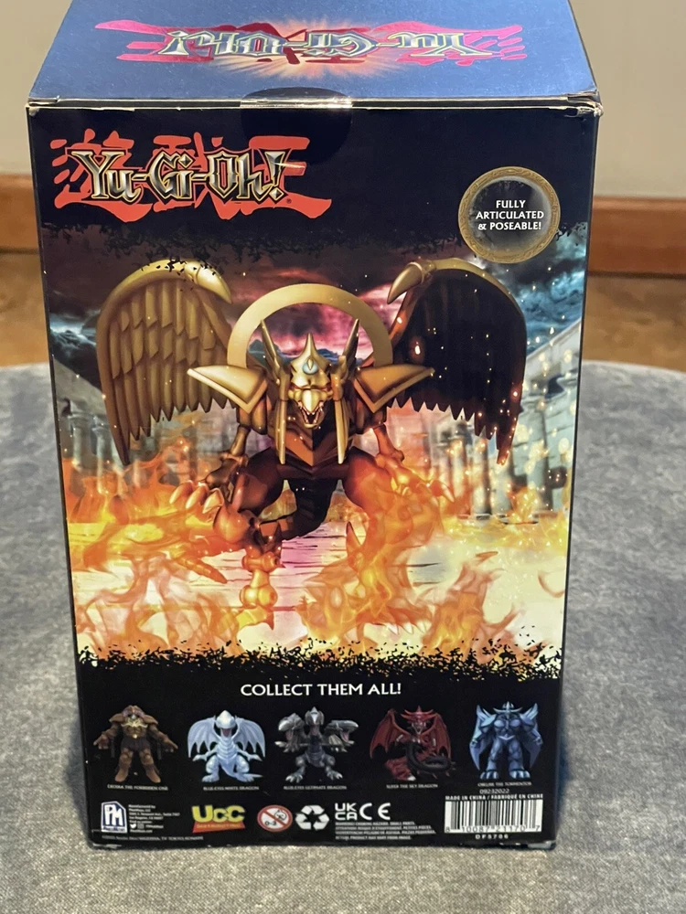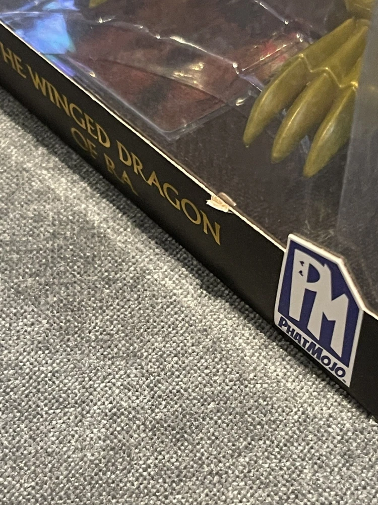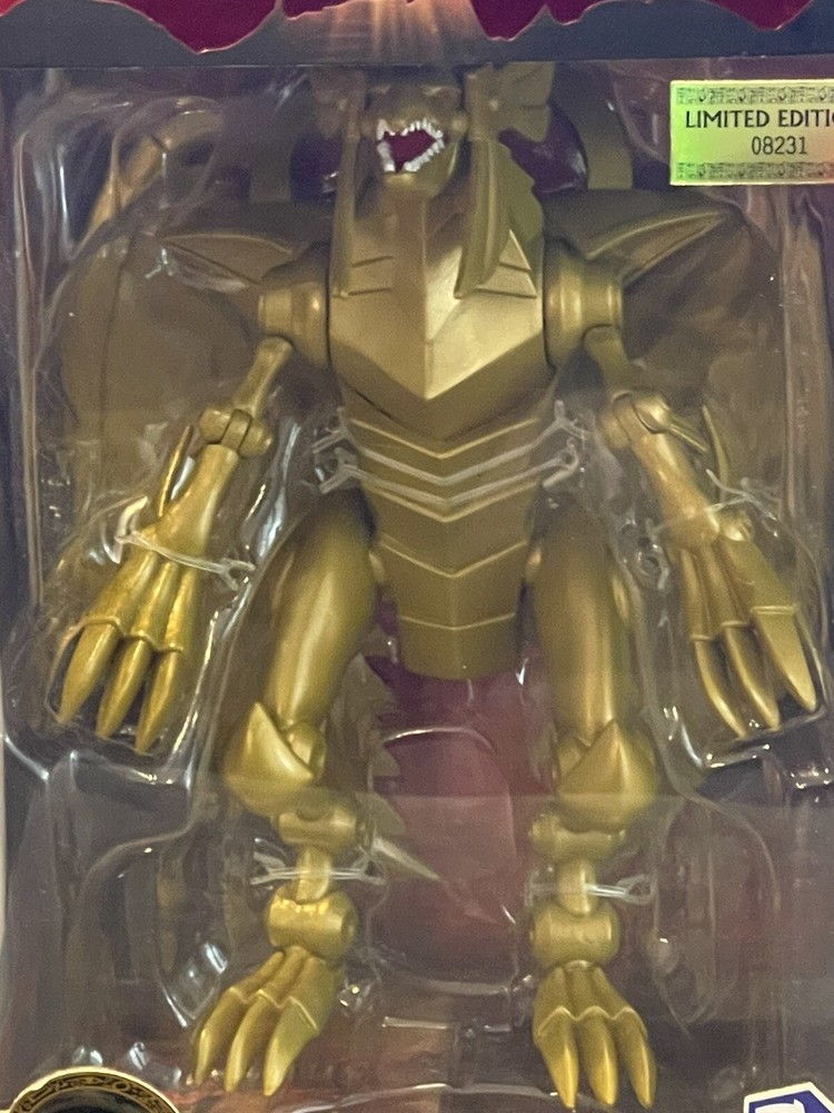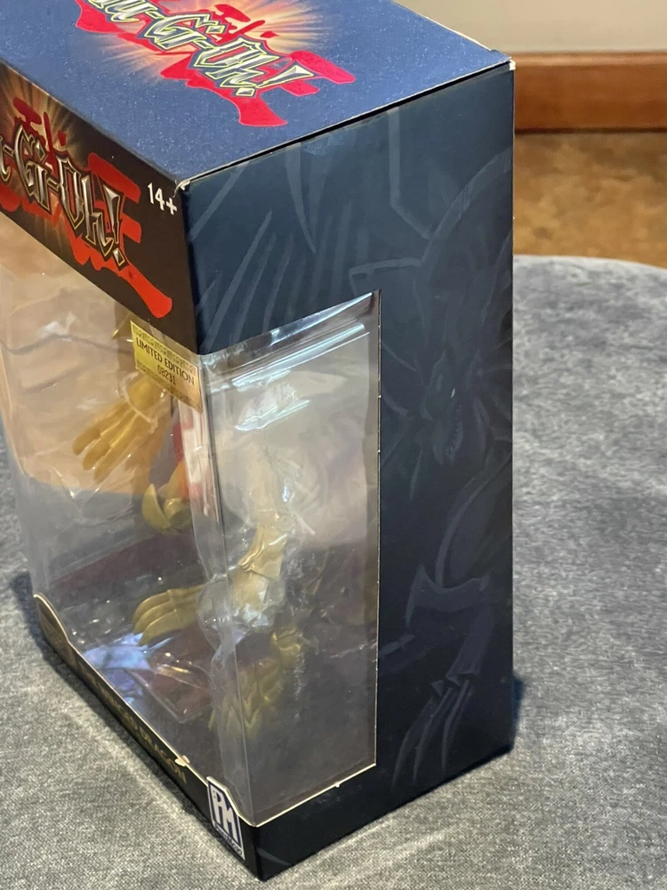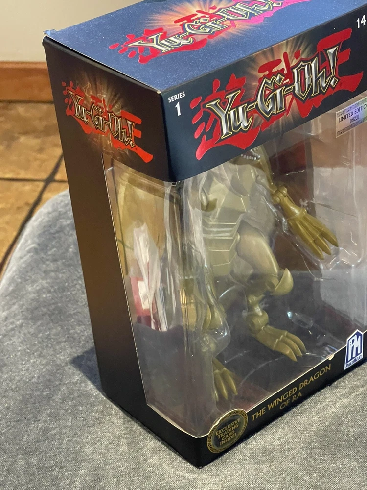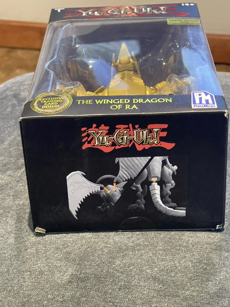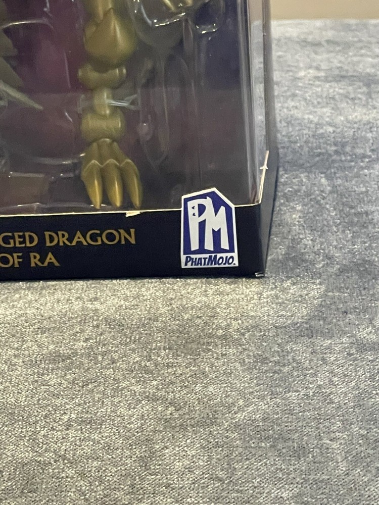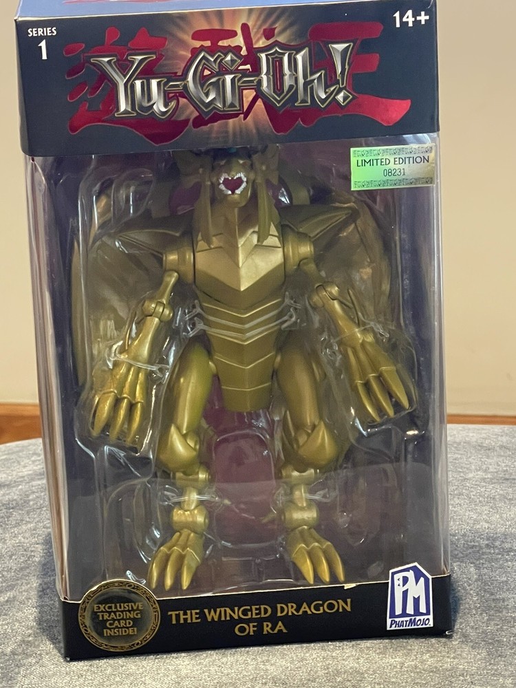 The product is a Yu-Gi-Oh! action figure of The Winged Dragon of Ra from Phatmojo's Series 1 Limited Edition collection. It comes with an exclusive card and is made of gold-colored plastic, representing the iconic dragon character from the Yu-Gi-Oh! franchise. This figure is inspired by the animated TV show and is a must-have for fans and collectors of Yu-Gi-Oh! merchandise.