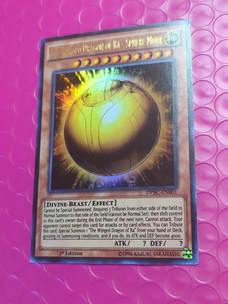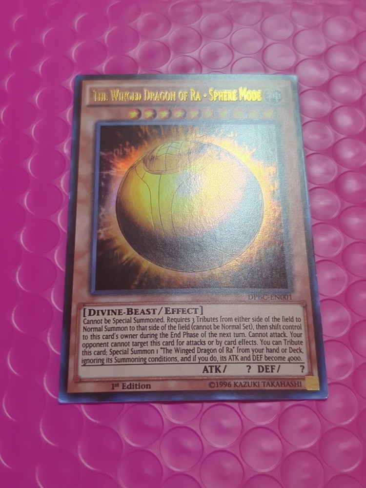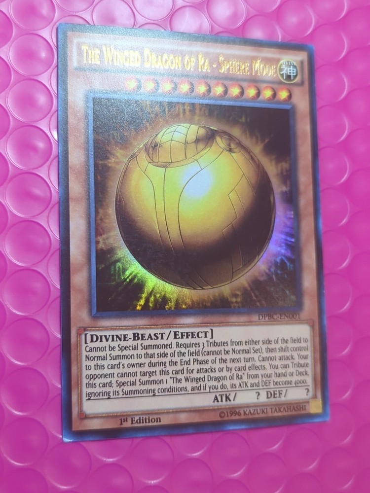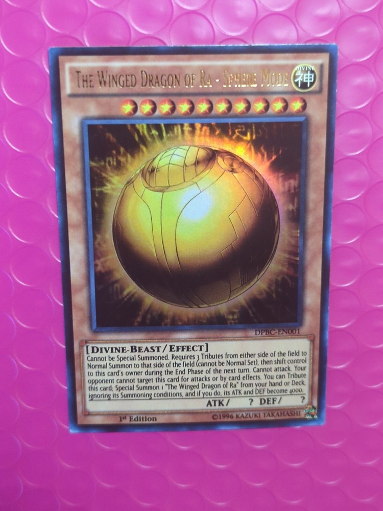 Yu-Gi-Oh! The Winged Dragon of Ra - Sphere Mode DPBC-EN001 1st edition Ultra NM. The condition of this card is: Near Mint. *All cards sold will be inside of a penny sleeve and top load card holder. Packaging will be in a bubble envelope for extra protection.* **In an attempt to empty my collection, every order will come with a gift of additional sleeved cards of various conditions that may fit the theme/archetype (depending on what's remaining in my collection). The bigger the sale, the bigger the gift!**