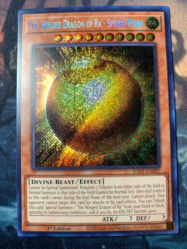 This card is absolutely stunning! The Secret Rare foil makes The Winged Dragon of Ra - Sphere Mode shine like a true Egyptian god card. The 1st Edition stamp and near-mint condition make it a prized collector's piece, especially from the 25th Anniversary set. The divine artwork pops with incredible detail, and it plays just as powerfully as it looks. A must-have for any serious Yu-Gi-Oh! fan—worth every penny for its rarity and beauty!