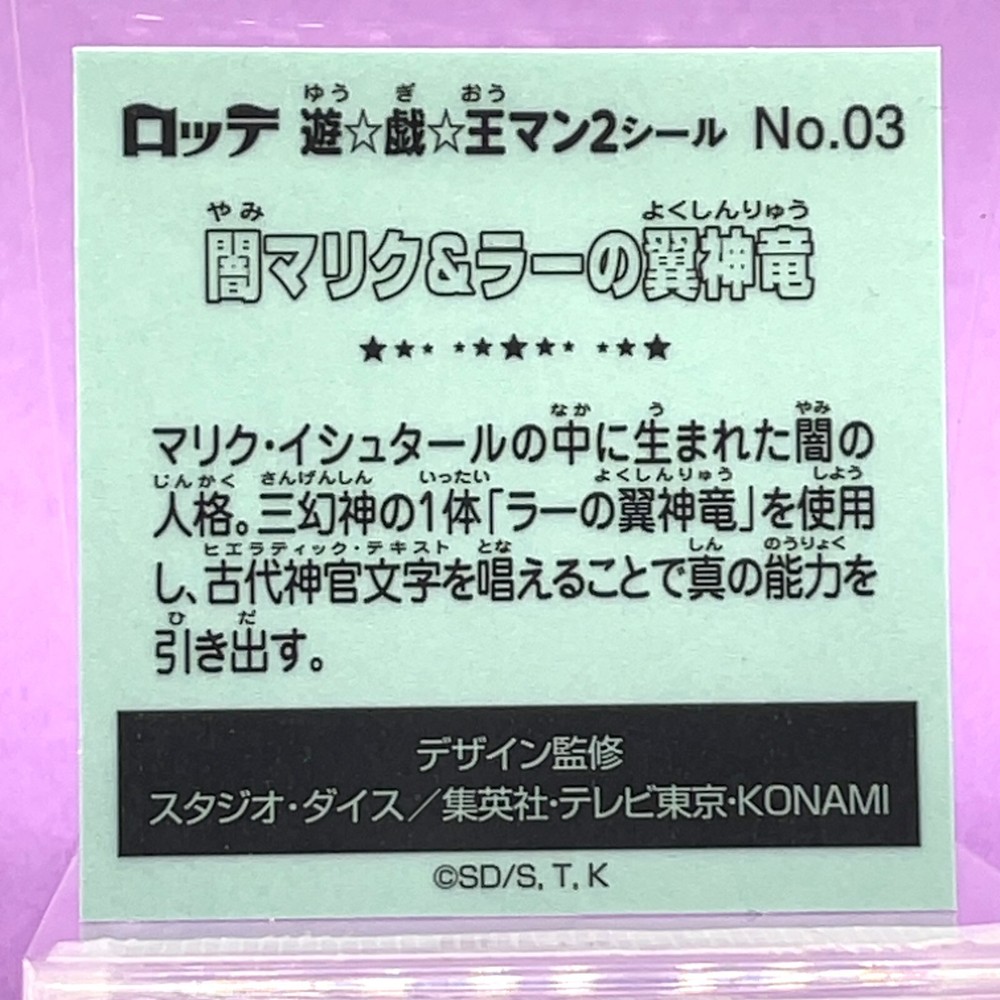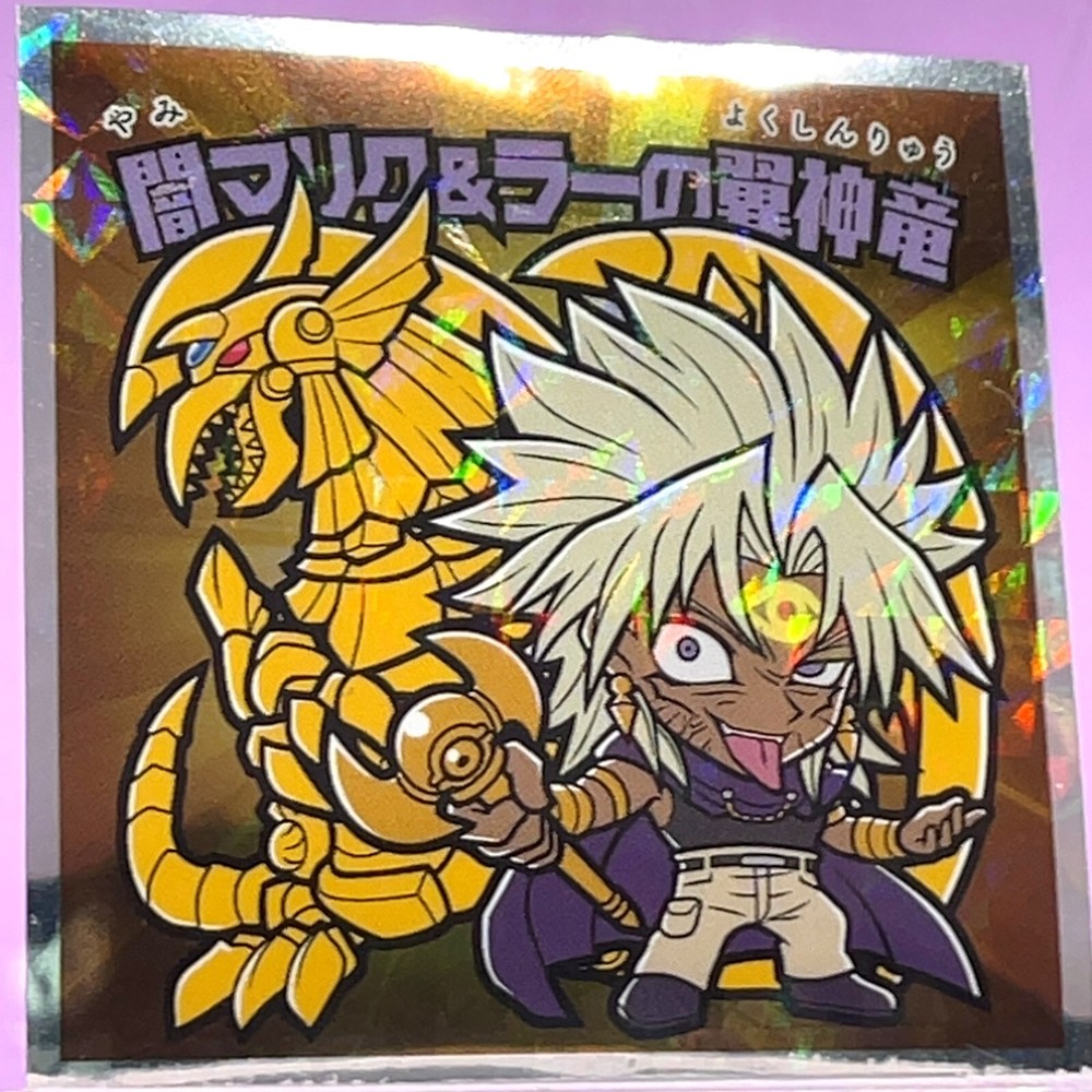 Yu-Gi-Oh! Wafer Sticker Seal Yami Marik & Winged Dragon of Ra No.03 Holo YuGiOh Description Back Text Lotte Yu-Gi-Oh! Man 2 Sticker No.03 Yami Marik & The Winged Dragon of Ra A dark personality born within Marik Ishtar. He uses one of the three Egyptian God Cards, "The Winged Dragon of Ra," and can unlock its true power by chanting ancient priestly script. Design Supervision: Studio Dice / Shueisha / TV Tokyo / KONAMI ©SD/S, T, K Payment Please pay within 5 days after purchase. Shipping I send a product by Japan Post or Fedex If your address is in a remote area due to shipping company regulations, please pay additional shipping charges via Paypal. Shipping is only available to the address registered in eBay. If you want us to send another address, please change your address on eBay and then place an order. Shipping is available from Monday to Friday. Weekends are not available because freight (shipping) companies are closed. We do not mark merchandise values below value or mark items as [gifts] Japan, US and International government regulations prohibit such behavior. Worldwide Shipping Economy shipping (Japan Post) : Air mail No tracking number - Asia : 5-14 days - USA : 7-14 days - Middle East, Europe, South America, North America, Africa :14-21 days Standard Shipping (Japan Post) : Air mail with tracking number - Asia : 5-14 days - USA : 7-14 days - Middle East, Europe, South America, North America, Africa :14-21 days Expedited shipping (Fedex) : With tracking number - Asia, Europe, North America: 1-2 days - USA, Middle East, Southern Europe, South America, Africa: 3-7 days (However, depending on the destination country, you may not be able to select Economy Shipping.) (Please note that these are estimated delivery times and actual delivery times may vary depending on the contents of the package, customs procedures, local handling conditions, etc.) Packaging We ensure your item is well-protected with robust and careful packaging. Cards, Stickers, Tickets, and Booklets: We place them between cardboard sheets and seal them in a bag to prevent bending and moisture damage. Even if you purchase multiple items, each will be individually sleeved. Mini-Figures: They are wrapped in bubble wrap, placed in a capsule, sealed in a bag, and further protected with thick cardboard. Large Figures and Other Items: We pack them carefully to ensure no direct pressure is applied to the item. Cancellations & Returns Cancellation or returns will be accepted only if the item has an obvious problem that was not mentioned in the listing description. If that, please let us know within 30 days you got the item. About Us We are located in Japan. If you have any questions or request about items, please feel free to ask us. We would be happy if you could add our products to your collection. About Importer's Obligation Import duties, taxes, and charges are not included in the item price or shipping cost. These charges are the buyer's responsibility. Please check with your country's customs office to determine what these additional costs will be prior to bidding or buying. Thank you for your understanding.