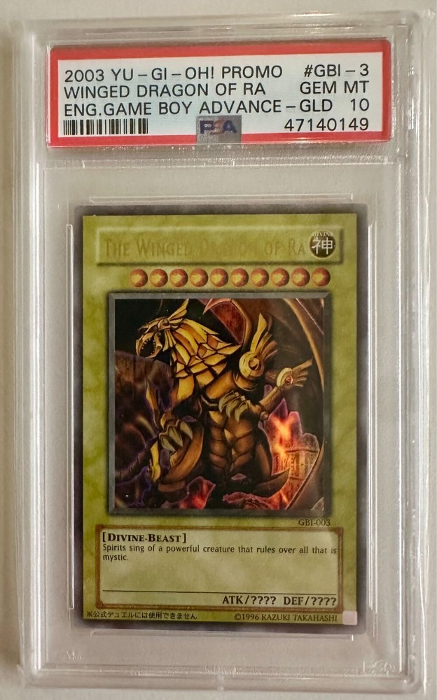 Yu-Gi-Oh! The Winged Dragon Of Ra (GBI-003, Gold God) - PSA 10 GEM MINT - English Secret Rare Description: You are viewing an incredibly rare and highly sought-after Yu-Gi-Oh! GBI-003 The Winged Dragon Of Ra trading card. Known as the Gold God version, this stunning Secret Rare card is one of the most iconic pieces in Yu-Gi-Oh! history and has been professionally graded as PSA 10 GEM MINT—the highest possible rating achievable by PSA. The Winged Dragon Of Ra stands prominently among the legendary Egyptian God Cards, revered for its immense power and significance in both the Yu-Gi-Oh! manga and trading card game. As the ultimate divine beast, it holds unparalleled prestige, rarity, and collector appeal. This card has been carefully preserved in archival-quality storage, maintaining its flawless condition in a smoke-free environment. With its PSA 10 rating certifying perfection, it represents a rare opportunity to add an extraordinary and impeccable card to your collection. Key Highlights: PSA 10 GEM MINT—highest possible grading! Yu-Gi-Oh! GBI-003 The Winged Dragon Of Ra Secret Rare (Gold God) One of the legendary Egyptian God Cards Professionally graded and authenticated by PSA Stored meticulously in archival-quality storage Comes from a clean, smoke-free home Shipping & Handling: Your card will be carefully and securely packaged and shipped promptly via tracked and signed-for delivery, including comprehensive insurance to ensure safe arrival. Please do not hesitate to reach out if you need additional photographs or further details—I’m always happy to help! Don't miss this rare chance to own an exceptional piece of Yu-Gi-Oh! collecting history!