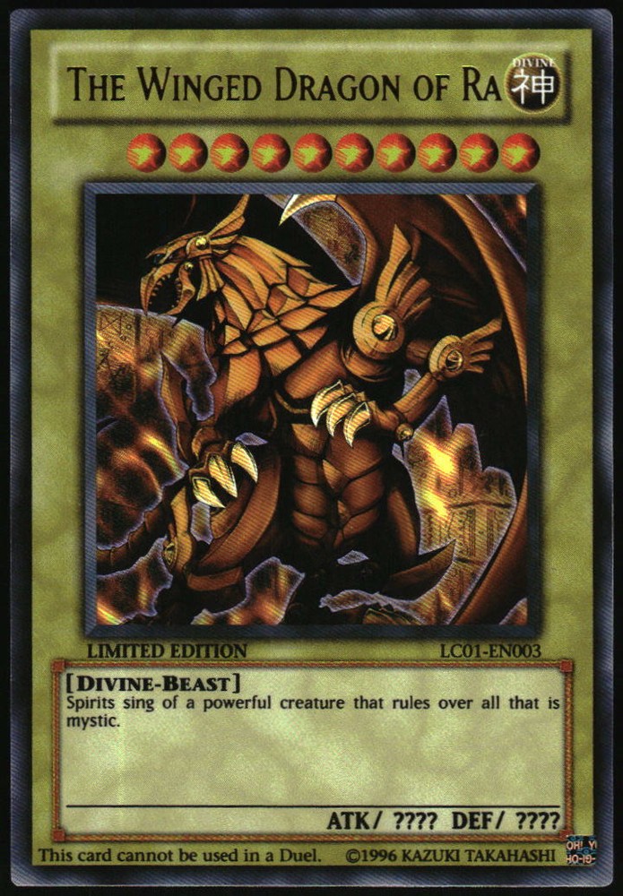 Yu-Gi-Oh! - Winged Dragon of Ra 2010 LC01-EN003 Ultra Rare Limited Edition Yu-Gi-Oh! - Winged Dragon of Ra 2010 LC01-EN003 Ultra Rare Limited Edition Yu-Gi-Oh! - Legendary Collection 1 Winged Dragon of Ra 2010 LC01-EN003 Ultra Rare Limited Edition Details Set: Legendary Collection 1 Card: Winged Dragon of Ra Number: LC01-EN003 Manufacturer: Yu-Gi-Oh! Year: 2010 Variation: Ultra Rare Version: Limited Edition Notes: Images on listing are scans of actual card you will receive, please use photos to determine condition. Card will be stored and shipped in a protective toploader. We sell collectible merchandise, with conditions ranging from used, vintage to brand new. We do our best to accurately describe the features and condition of each item. Due to the nature of these products, the item and/or original packaging may have handling wear, aging, etc. Please carefully review the description and photos to evaluate the condition of the item to ensure it meets your expectations prior to purchase. We do not use stock images , each photo on this listing is of the actual item for sale. We do offer combined shipping for multiple items going to the same address. Of course, feel free to ask us any questions you may have! Thank you for shopping with us. Please visit our eBay store to check out our other collectible items! Welcome Shipping Returns Thanks for stopping by our store! We appreciate the opportunity to earn your positive feedback and share our unique collection with you! If you have any concerns, please contact us immediately so we can assist you. We are very responsive and happy to assist. Here at Back in the Day, we are pleased to share our collection of vintage and modern collectibles with you. From classic movie, music and gaming memorabilia to pop culture toys and so much more, take home a piece of nostalgia from our ever-changing stockroom. Be sure to browse all our categories frequently so you don't miss out on that rare find! Shipping Speed We are proud to provide fast service to our customers; your order will be shipped within 1 business day of placing your order. On average, domestic First Class/Ground Advantage packages arrive in 5-7 business days (depending on destination). On average, domestic Priority packages arrive in 3-5 business days (depending on destination). On average, FedEx Ground/Home packages arrive in 2-6 business days. We observe all government holidays. We cannot guarantee delivery dates. Packaging We take care in packaging each order - you can rest assured that your items will be thoughtfully packaged to minimize risk and arrive safely to you. Combined Shipping We're happy to combine shipping for multiple items going to the same address.* Multiple items should auto-combine in your cart, but if not, you can request an invoice with combined shipping. We will choose the lowest cost shipping option during fulfillment meeting all carrier weight and policy requirements. *We are unable to combine shipping on auction orders for separate auctions (auctions ending on different dates). Orders must be paid within four days from auction end, or will be cancelled. Additional Once we ship your order, we will provide you tracking information. If you do not receive your shipment within 11 business days of placing your order, feel free to contact us and we’ll be happy to investigate it further. If an item is returned to us due to an incorrect or incomplete address entered during purchase, the buyer is responsible for paying shipping cost if they want the item resent. If the item will not be resent, the buyer will be issued a refund for the cost of the item, not the cost of shipping paid. Please review your shipping details to ensure successful delivery. Please also note that the shipping rates for items we sell are weight-based. We will choose the most cost-efficient delivery method for your order based on weight and size. To reflect the policies of the shipping companies we use, all weights will be rounded up to the nearest pound or ounce, depending on the carrier requirements. We are always available if you have questions! We value your business. Just let us know what you need help with and we will respond quickly. If an item is damaged in shipping, we will be happy to help. Please contact us with your order number and details, including pictures of the damaged item within 30 days of purchase. Due to the nature of the products we sell, and the fact that many are vintage and not new merchandise, items are not eligible for return without reasonable cause. Please take care in reviewing product descriptions and photos before placing your order to be fully aware of the condition of the item. Feel free to ask any questions you may have about an item and we will respond as soon as possible.
