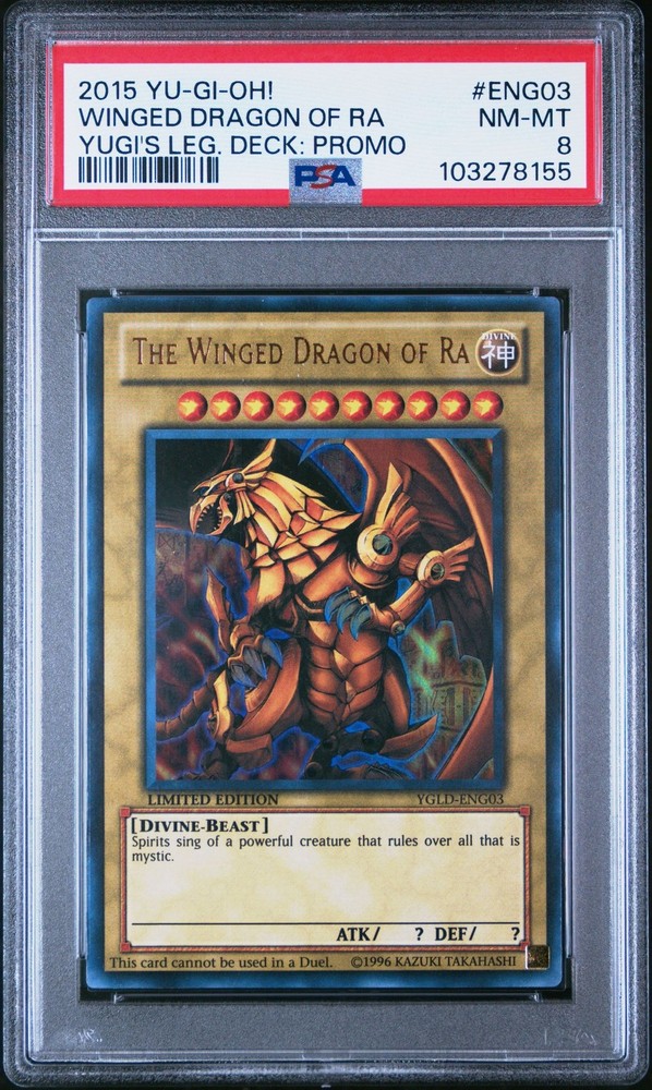 Yu-Gi-Oh! - Winged Dragon of Ra 2015 YGLD-ENG03 Limited Edition PSA 8 Yu-Gi-Oh! - Winged Dragon of Ra 2015 YGLD-ENG03 Limited Edition PSA 8 Yu-Gi-Oh! - Legendary Deck: Promo Winged Dragon of Ra 2015 YGLD-ENG03 Limited Edition PSA 8 Details Set: Legendary Deck: Promo Card: Winged Dragon of Ra Number: YGLD-ENG03 Manufacturer: Yu-Gi-Oh! Year: 2015 Variation: Limited Edition Graded: PSA 8 Notes: Images on listing are scans of actual card you will receive, please use photos to determine condition. Card will be stored and shipped in a protective toploader. We sell collectible merchandise, with conditions ranging from used, vintage to brand new. We do our best to accurately describe the features and condition of each item. Due to the nature of these products, the item and/or original packaging may have handling wear, aging, etc. Please carefully review the description and photos to evaluate the condition of the item to ensure it meets your expectations prior to purchase. We do not use stock images , each photo on this listing is of the actual item for sale. We do offer combined shipping for multiple items going to the same address. Of course, feel free to ask us any questions you may have! Thank you for shopping with us. Please visit our eBay store to check out our other collectible items! Welcome Shipping Returns Thanks for stopping by our store! We appreciate the opportunity to earn your positive feedback and share our unique collection with you! If you have any concerns, please contact us immediately so we can assist you. We are very responsive and happy to assist. Here at Back in the Day, we are pleased to share our collection of vintage and modern collectibles with you. From classic movie, music and gaming memorabilia to pop culture toys and so much more, take home a piece of nostalgia from our ever-changing stockroom. Be sure to browse all our categories frequently so you don't miss out on that rare find! Shipping Speed We are proud to provide fast service to our customers; your order will be shipped within 1 business day of placing your order. On average, domestic First Class/Ground Advantage packages arrive in 5-7 business days (depending on destination). On average, domestic Priority packages arrive in 3-5 business days (depending on destination). On average, FedEx Ground/Home packages arrive in 2-6 business days. We observe all government holidays. We cannot guarantee delivery dates. Packaging We take care in packaging each order - you can rest assured that your items will be thoughtfully packaged to minimize risk and arrive safely to you. Combined Shipping We're happy to combine shipping for multiple items going to the same address.* Multiple items should auto-combine in your cart, but if not, you can request an invoice with combined shipping. We will choose the lowest cost shipping option during fulfillment meeting all carrier weight and policy requirements. *We are unable to combine shipping on auction orders for separate auctions (auctions ending on different dates). Orders must be paid within four days from auction end, or will be cancelled. Additional Once we ship your order, we will provide you tracking information. If you do not receive your shipment within 11 business days of placing your order, feel free to contact us and we’ll be happy to investigate it further. If an item is returned to us due to an incorrect or incomplete address entered during purchase, the buyer is responsible for paying shipping cost if they want the item resent. If the item will not be resent, the buyer will be issued a refund for the cost of the item, not the cost of shipping paid. Please review your shipping details to ensure successful delivery. Please also note that the shipping rates for items we sell are weight-based. We will choose the most cost-efficient delivery method for your order based on weight and size. To reflect the policies of the shipping companies we use, all weights will be rounded up to the nearest pound or ounce, depending on the carrier requirements. We are always available if you have questions! We value your business. Just let us know what you need help with and we will respond quickly. If an item is damaged in shipping, we will be happy to help. Please contact us with your order number and details, including pictures of the damaged item within 30 days of purchase. Due to the nature of the products we sell, and the fact that many are vintage and not new merchandise, items are not eligible for return without reasonable cause. Please take care in reviewing product descriptions and photos before placing your order to be fully aware of the condition of the item. Feel free to ask any questions you may have about an item and we will respond as soon as possible.