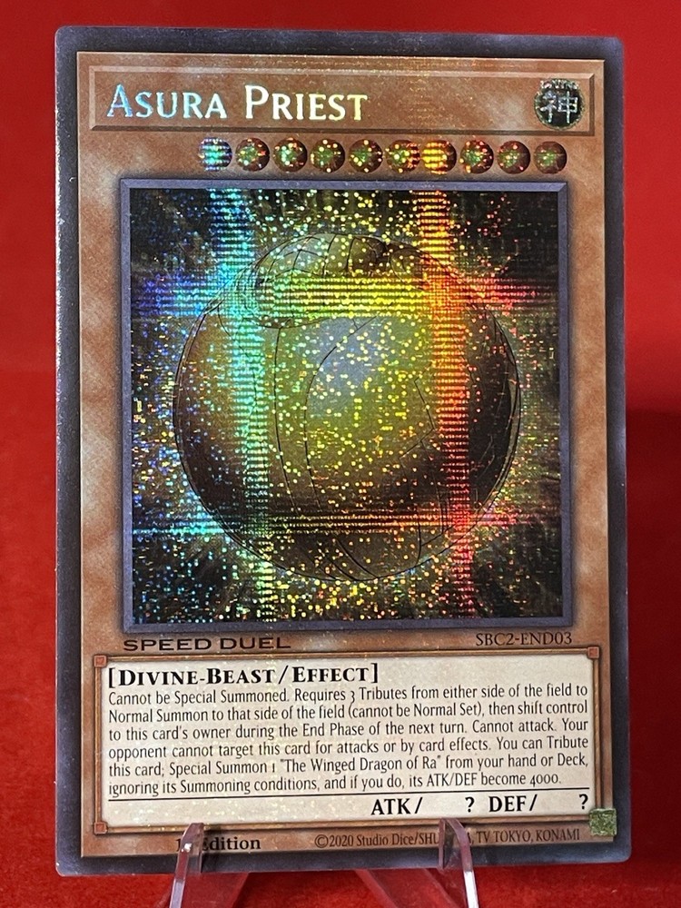 Misprint!! Print name of Asura Priest is inncorrect! Dive into the realm of myth and strategy with the Yu-Gi-Oh! Winged Dragon of Ra - Sphere Mode card, a Speed Duel specialty from the thrilling Battle City Finals set. This Prismatic Secret Rare card boasts a distinctive foil finish that captures the eye, making it a standout addition to any collection or competitive deck. Featuring the Asura Priest, this Effect-type card with the creature/monster type of Divine-Beast is poised to bring divine attributes to your game. The card, numbered SBC2-END03, is a 1st Edition release and, although it comes with a unique name misprint, it does not bear an autograph, ensuring its pristine design remains the focus.