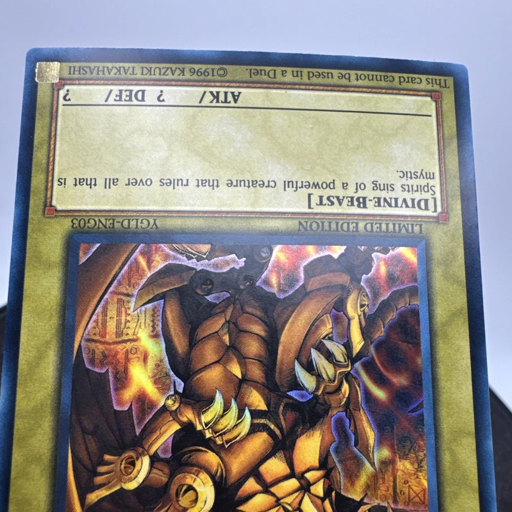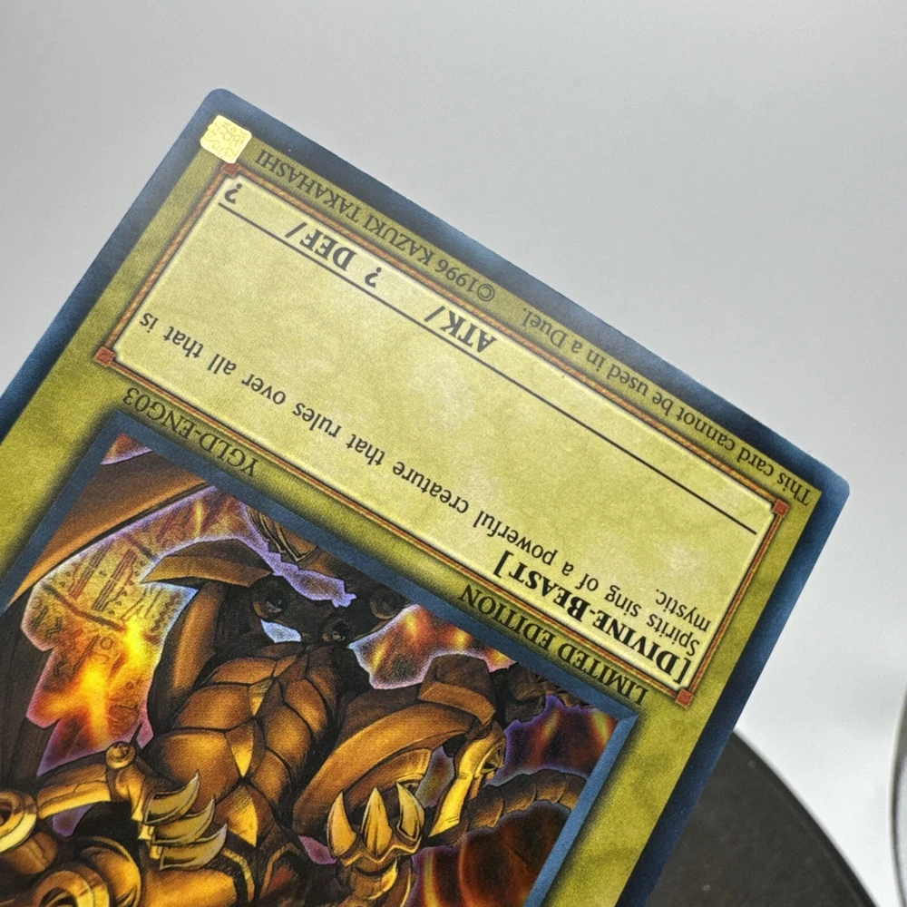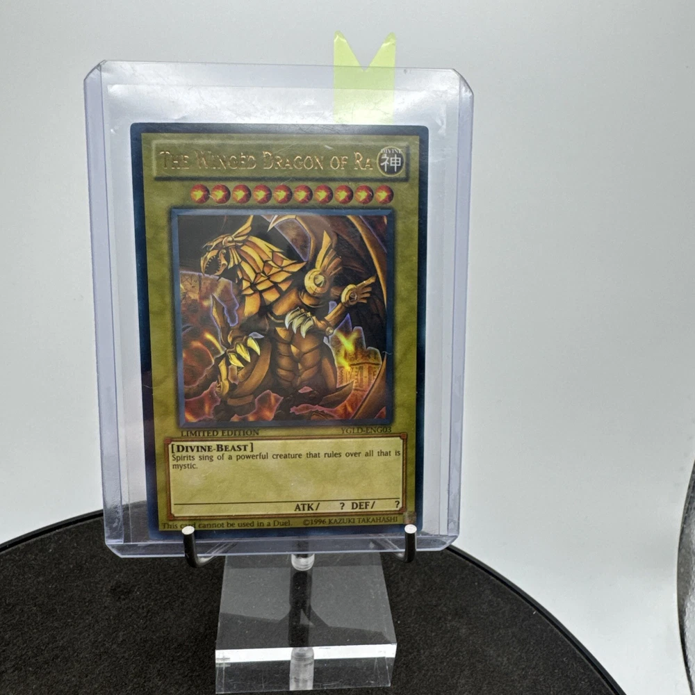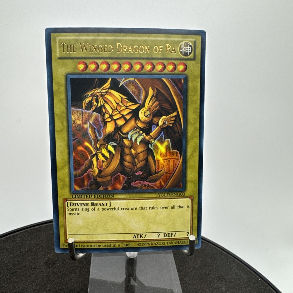 Unleash the power of myth and strategy with "The Winged Dragon of Ra" from Yugi's Legendary Decks. This iconic card is a must-have for any serious collector or player of the Yu-Gi-Oh! Trading Card Game. Manufactured in 2015, it represents the epitome of legendary rarity and is a standout piece from the YGLD-ENG03 series. Enhance your deck with the might of "The Winged Dragon of Ra" and experience the thrill of owning a piece of Yu-Gi-Oh! history. Its legendary status not only signifies its power within the game but also makes it a prized collectible for enthusiasts and competitors alike.
