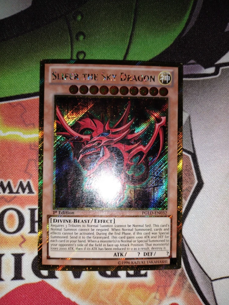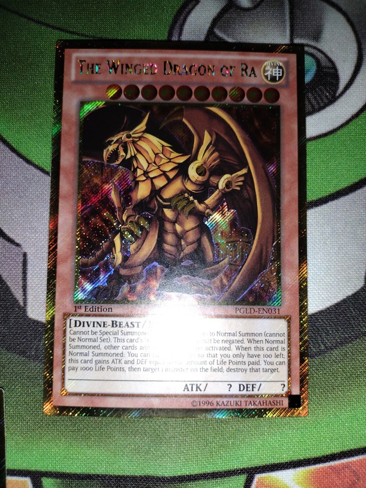 slifer the sky dragon, obelisk the tormentor, and the winged dragon of ra from pgld l.p. to n.m. condition see pictures all 1st edition...