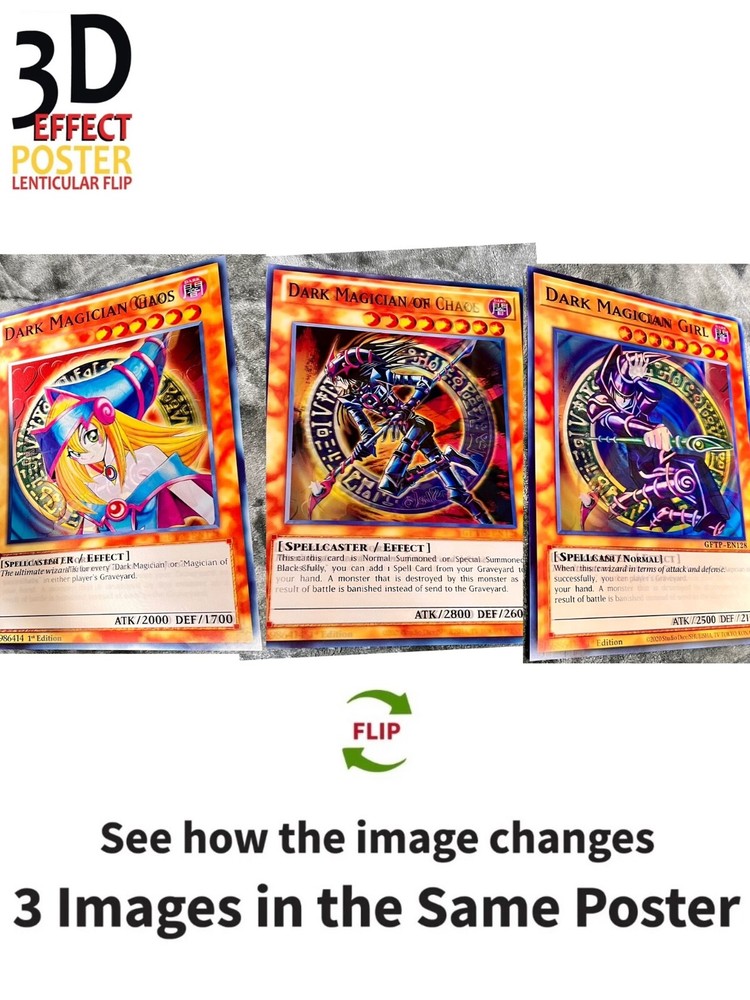 MULTIPLE PICTURES IN ONE-View from different angles and watch them "flip and change" in front of you Poster, 3D Effect, 3 images in one, water resistant 3D lenticular posters change their image with the viewing angle. They are made to last, from a superior quality material, it is resistant to sun, water, rain and snow. Measures: Width: 11.75 inches (29.845 centimeters) Height: 15.5 inches (39.37 centimeters) Great for the bedroom, living room, office, or anywhere.