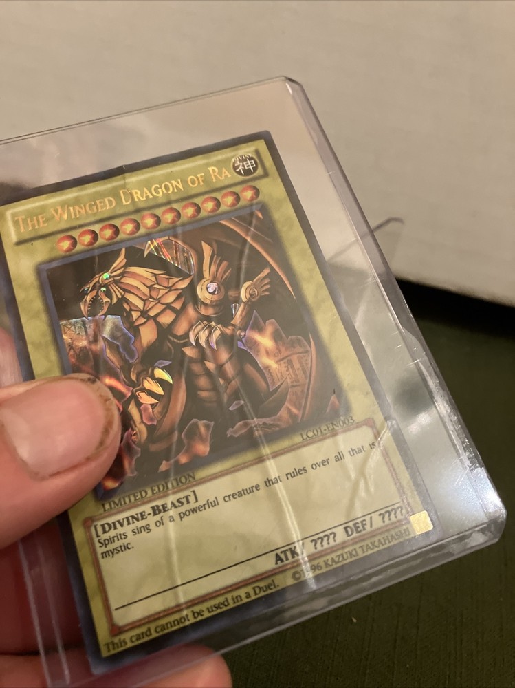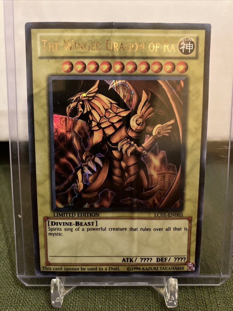 This Yu-Gi-Oh! TCG card is the highly sought-after The Winged Dragon of Ra, a Divine-Beast monster type with Divine card type and Holo finish. Its rarity is Ultra Rare and it has few creases definitely has gotten use. The card is in English language and manufactured by Konami as part of the LC01-EN003 edition, which is a Limited Edition. The card's attributes include Color (Divine), Attack/Power (????), Defense/Toughness (????), and Card Name (The Winged Dragon of Ra). It is a great addition to any collection of collectible card games and is sure to impress fellow enthusiasts.