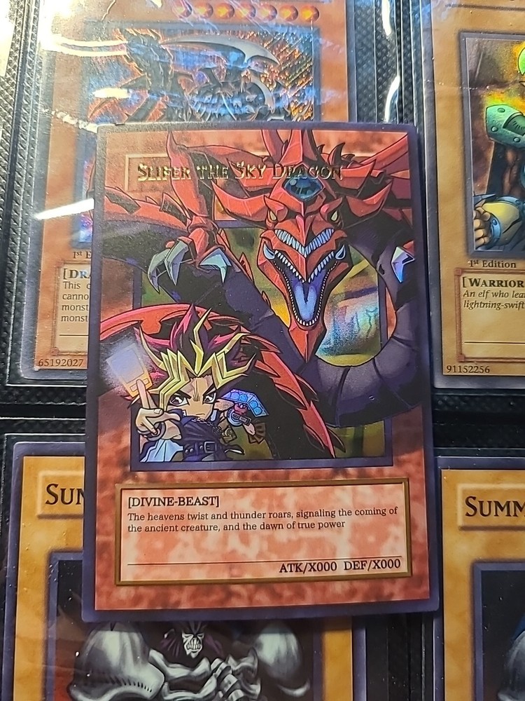 This Yu-Gi-Oh! card features the powerful monster Slifer the Sky Dragon, as well as other characters such as Yugi Mutou and Kaiba Seto. The holographic finish adds a special touch to the card's design, making it a rare and valuable addition to any collection. The card belongs to the Goddess Story game and is part of the ACG set. It has a rare holo rare rarity and is classified as a monster card with a duel monster stage. The card's name is Slifer the Sky Dragon, and it is illustrated with a textural anime style.