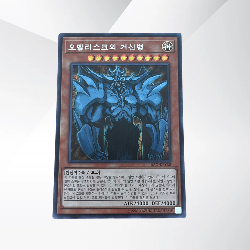 Secret Rare Obelisk The Tormentor card from the Korean release of the Duelist Road Piece of Memory set