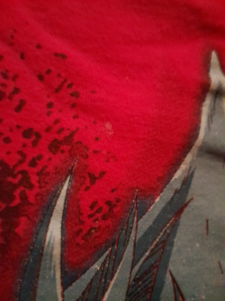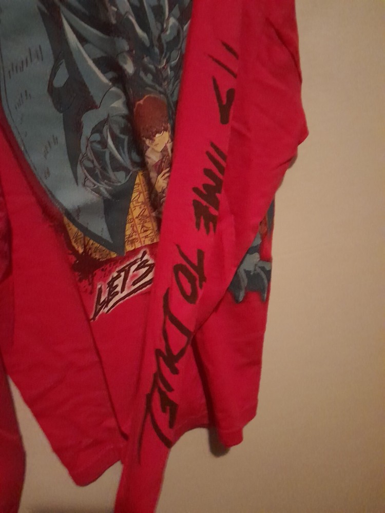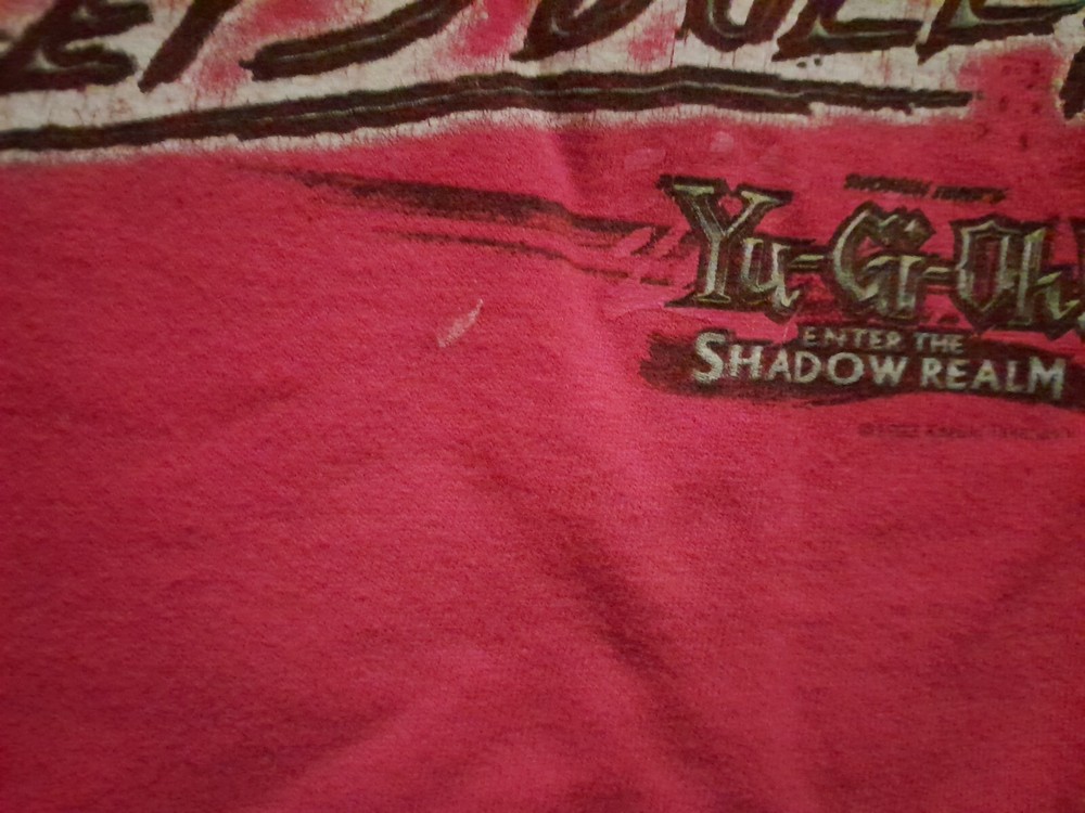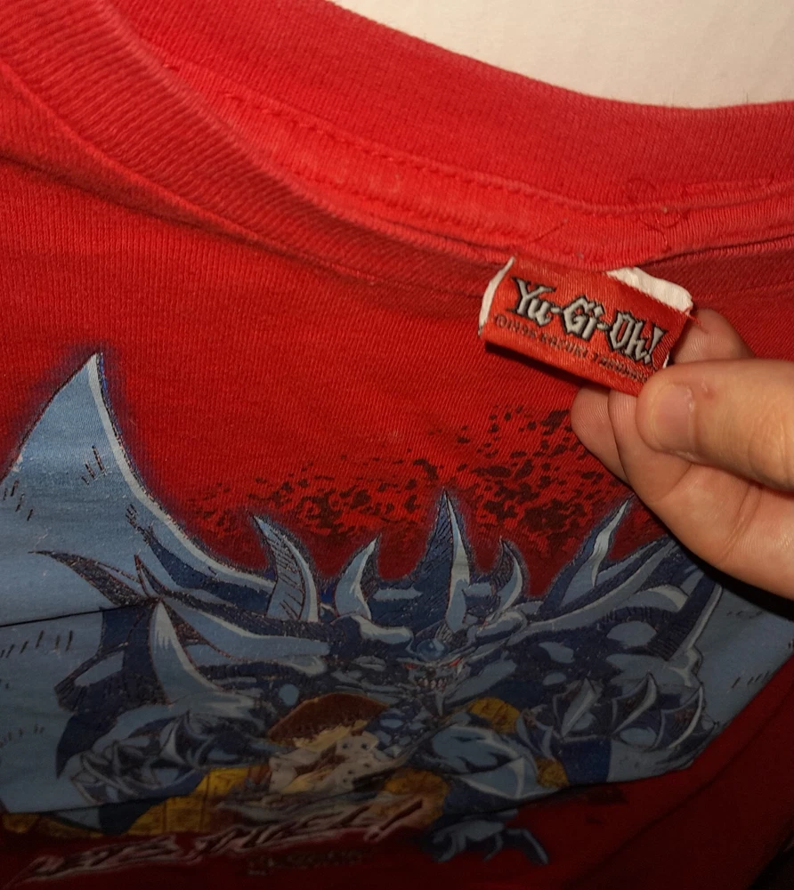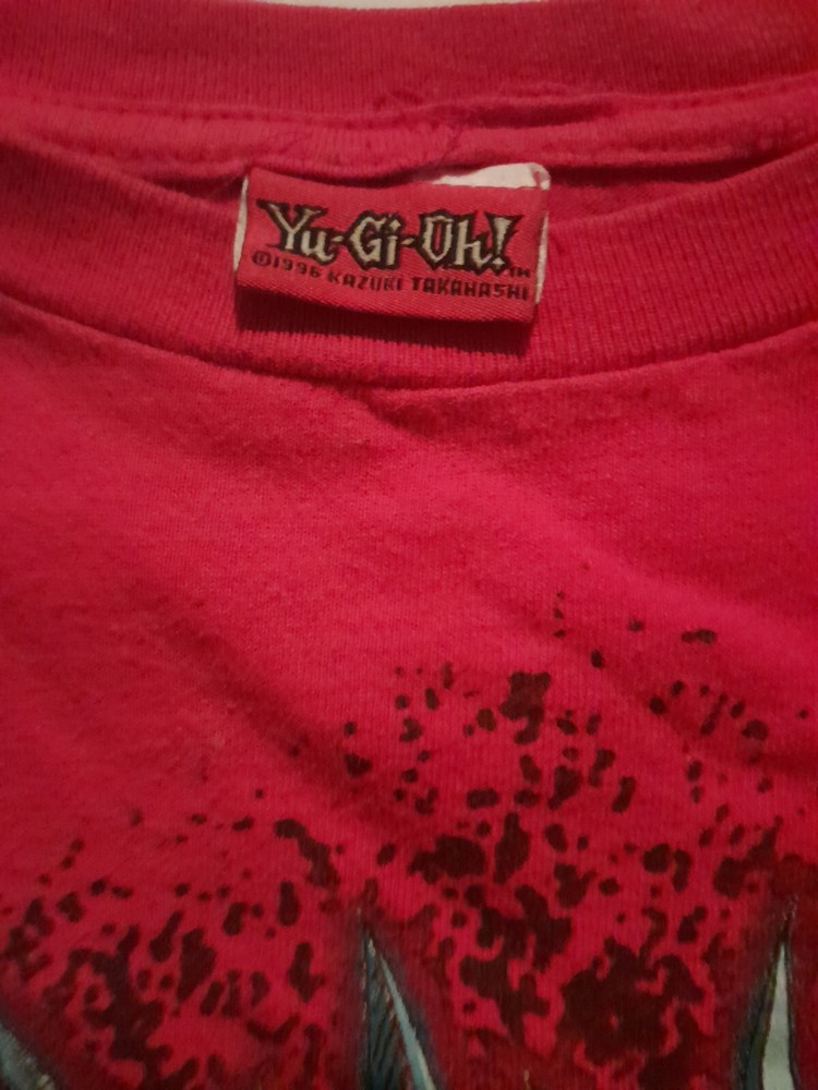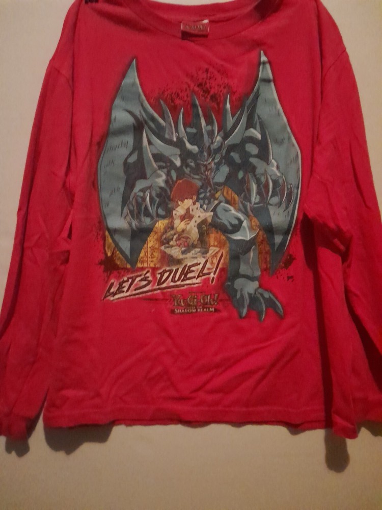 Yugioh 1996 Long Sleeve T Shirt Obelisk The Tormentor And Kiba. Tags have been cut out of the shirt. Part of brand tag is still half attached. Size is unknown. Shirt is a kids boys size that is roughly the same size as an adults small. The shirt is 20 inches long from shoulder to waist. 18 inches wide from shoulder to shoulder. Neck is 7 inches wide. Sleeves are 19 inches long. There are a few white stains on different areas of the shirt which are pictured. There is one small black stain on the back of the shirt with a dime beside it for comparison; the stain is about the size of the tip of a sharpie. Lettering on the left sleeve says "it's time to duel." Mild dark discoloration to the cuffs of the sleeves.