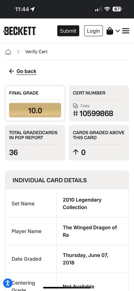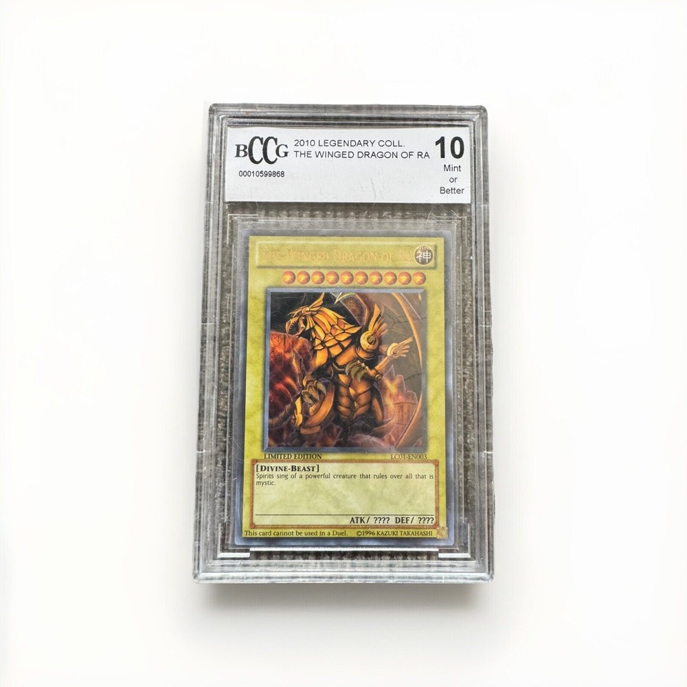 This limited edition Yu-Gi-Oh! card features the iconic Winged beast, The Winged Dragon of Ra, in stunning holo finish. It is part of the Yu-Gi-Oh! Legendary Collection set, manufactured by Konami in 2010. The card is graded Beckett BCCG 10 Mint, ensuring its authenticity and value. On the Beckett website it shows 0 cards are graded higher than this one. The card is an ultimate rare effect type, with Yami Yugi, Seto Kaiba, and Yugi Muto as its characters. It is suitable for players aged 6+ and is a must-have for any vintage Yu-Gi-Oh! collector. This card is in English language and is a standard size for the Yu-Gi-Oh! TCG game. Get your hands on this ultimate rare card today! Item will be double or triple packed for protection during shipping.