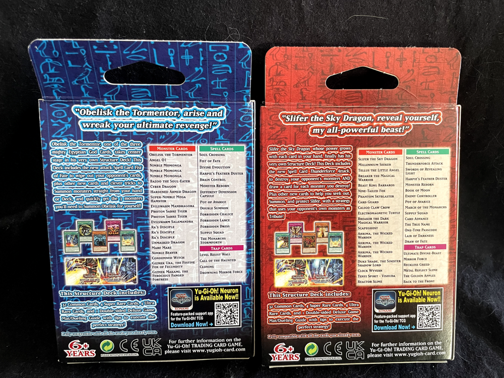 Delve into the mystical world of Yu-Gi-Oh! with the Egyptian God Structure Decks, featuring the formidable Obelisk the Tormentor and Slifer the Sky Dragon. These decks are a must-have for enthusiasts and collectors alike, offering a unique gaming experience with cards that boast the iconic Egyptian God characters. The 1st Edition status adds a layer of exclusivity to these already sought-after sets.Crafted by Konami and produced in Belgium, each deck comes in English language, adhering to the Japanese card size standard. Designed for players aged 6 and up, these decks are constructed with premium card stock, ensuring durability during play. Whether for competitive gaming or collecting, these Egyptian God Structure Decks are a treasure for any Yu-Gi-Oh! fan.