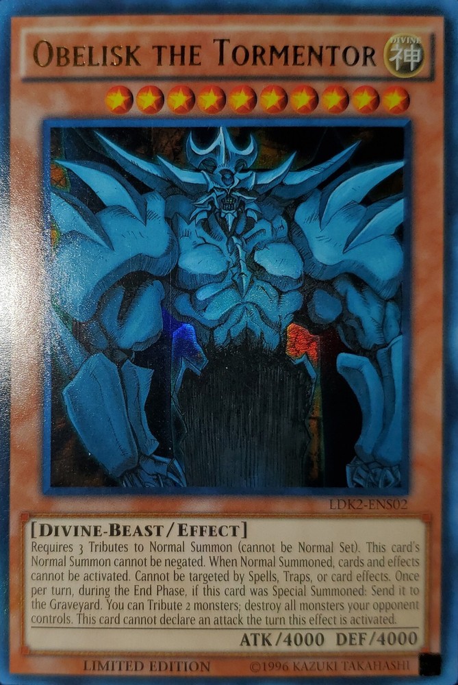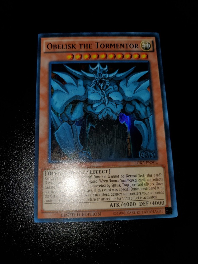 Yugioh 2024 Obelisk The Tormentor Limited Ed. LDK2-ENS02 Near Mint Will ship safely & securely. Penny sleeve inside toploader wrapped in an antiweather and antislip team bag. As a long time seller on eBay, I want every order placed with me to arrive timely and safely. You are entrusting me with your hard earned money and I will not only meet, but surpass your trusted expectations. Feel free to message me for further pictures or questions.