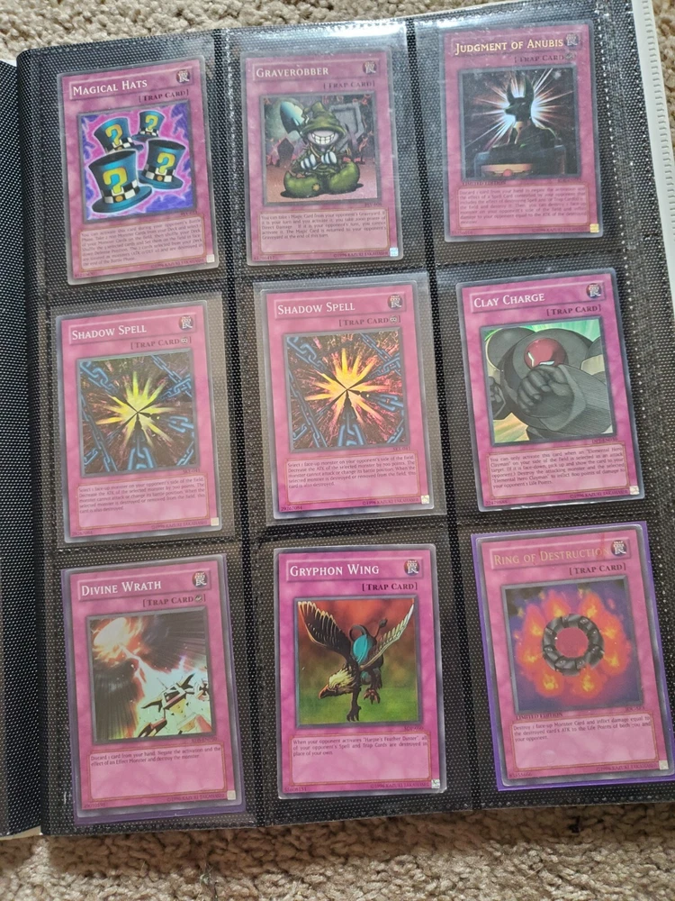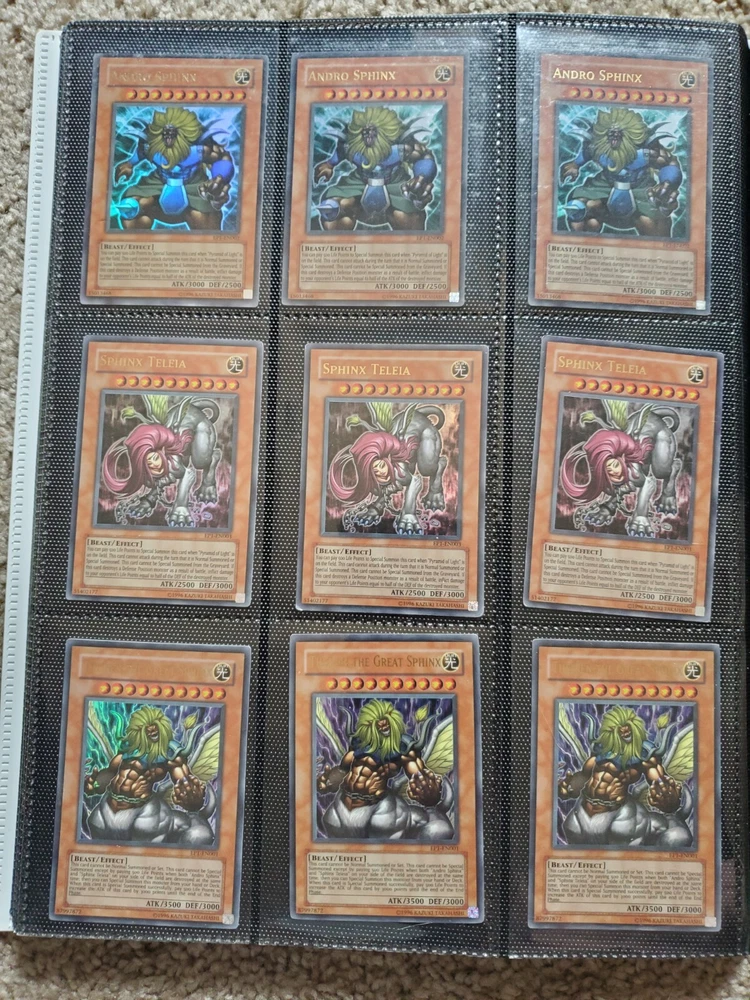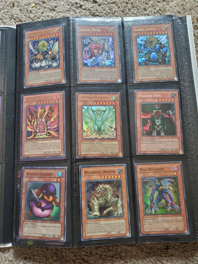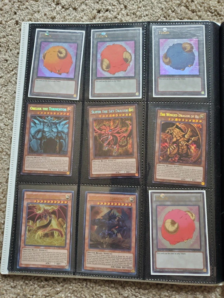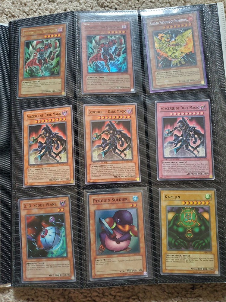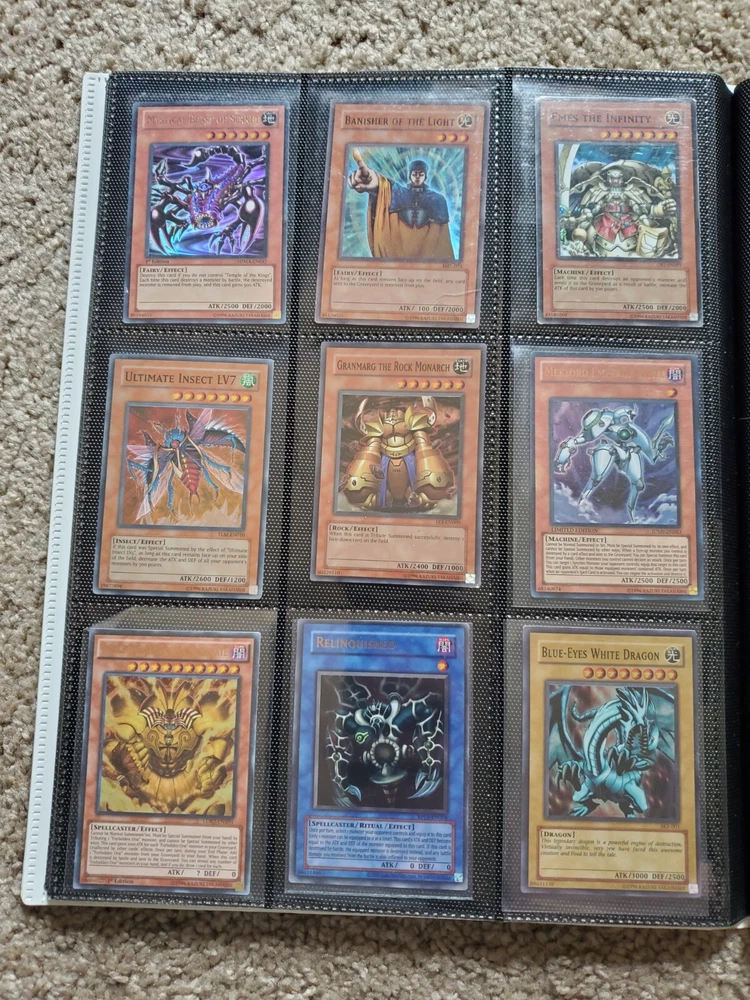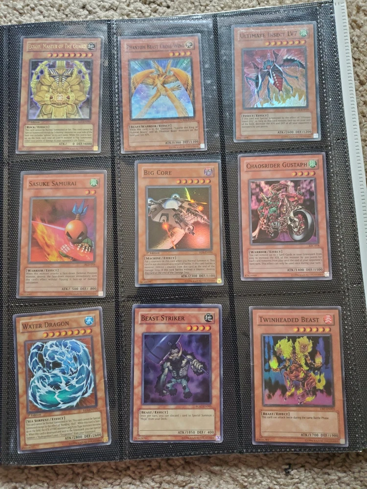 Yu-Gi-Oh binder collection, Includes vintage and some modern. Binder is included. Many Super Rares / Ultra Rares / Some Secret Rares 1st Editions / Unlimited / Limited Editions Some cards are Exodia, Blue-Eyes White Dragon, Dark Magician, Black Luster Soldier, Buster Blader, Flame Swordsman, Slifer the Sky Dragon, Winged Dragon of Ra, Obelisk the Tormentor, Conditions are mixed. Please bid in mind of mixed conditions. Sold as is