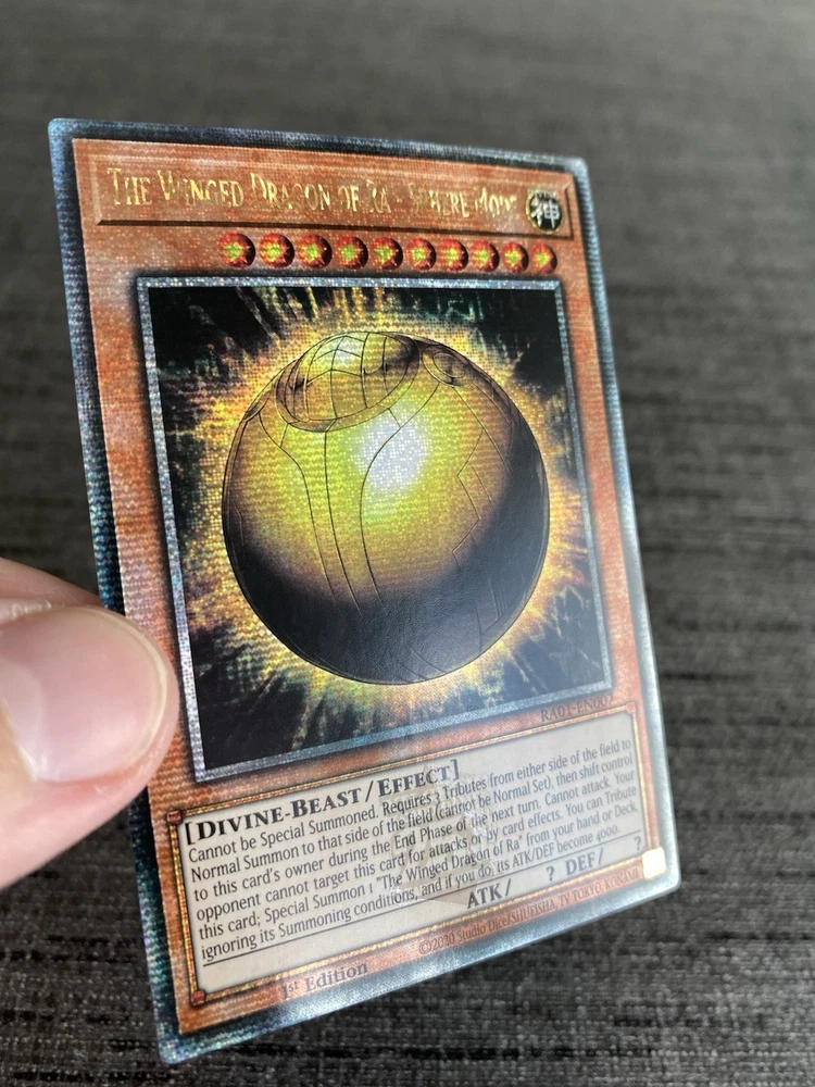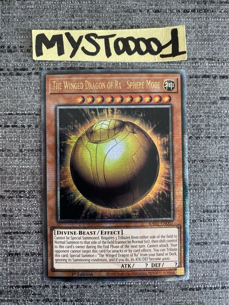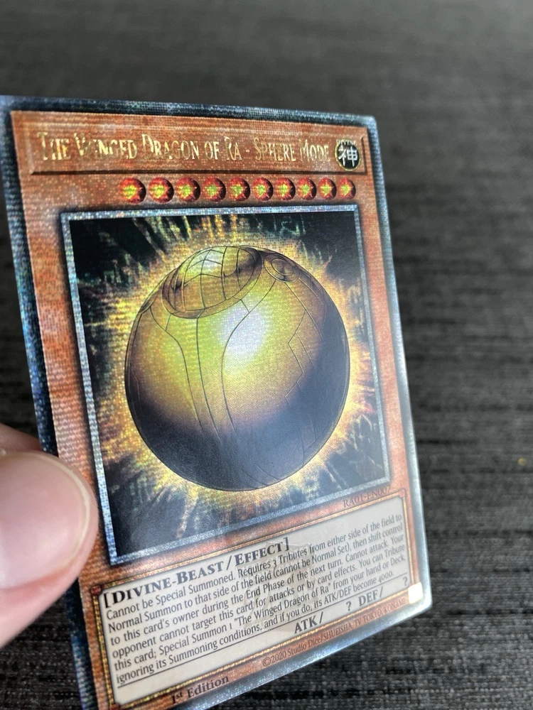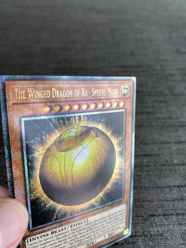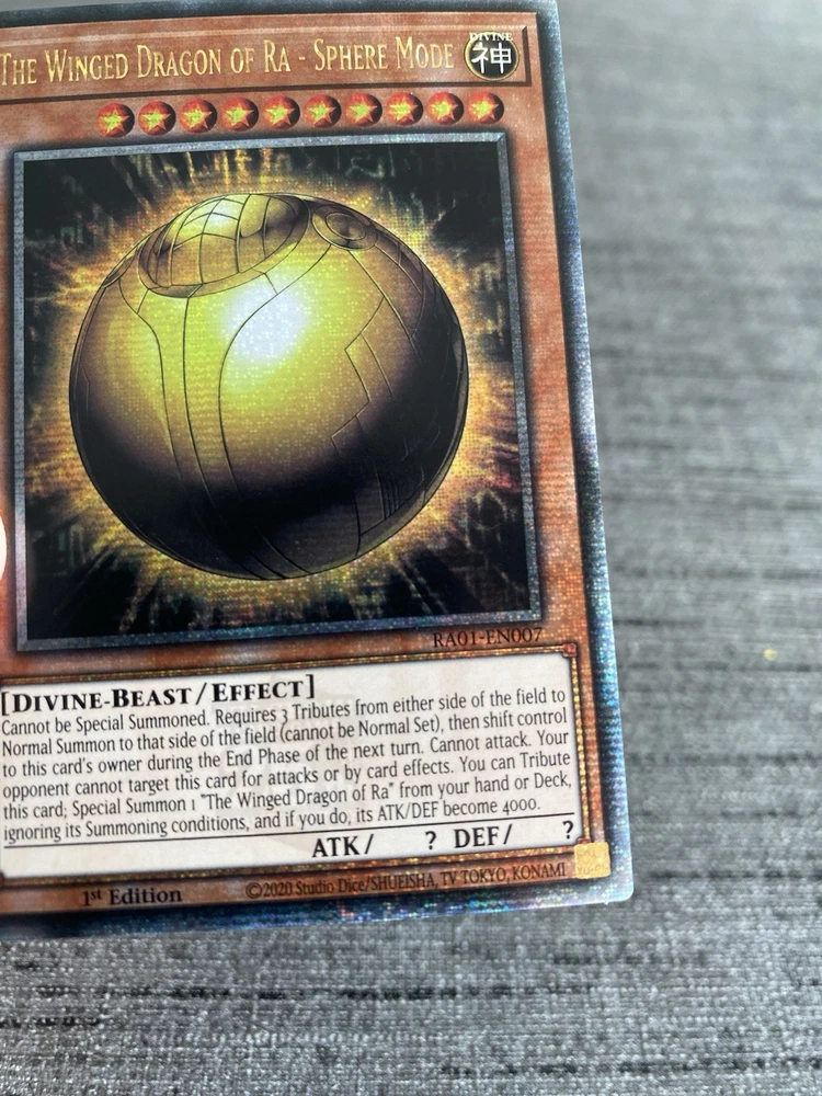 Carte Yu-gi-oh! The Winged Dragon Of Ra Sphere Mode RA01-EN007 QCR Anglaise. Carte Yugioh Anglaise ! QcR / Quarter Century / Quart de siècles/ Rareté du 25ieme anniversaire / 25th QCR État ; Excellent Plusieurs photos sont disponibles avex et sans flash, n’hésitez pas à toutes les regarder pour voir les divers défauts possible. La carte est dans un excellent état, elle peut posséder divers défaut légers; micros rayures, point blancs, mauvais centrage, coins/côtés abîmés blanchis etc.. Envois rapide et soigné/
