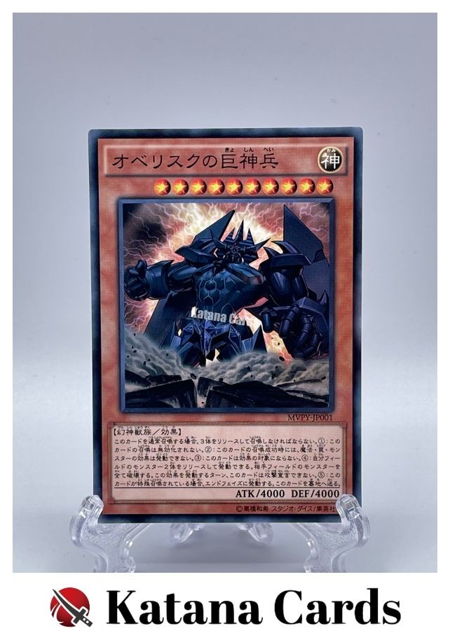 Yugioh Cards | Obelisk the Tormentor Kaiba Corporation Rare | MVPY-JP001 Japanese C ondition Near Mint to Excellent Yugioh Cards Check our Yugioh cards here. D iscounts!!! Buy more than 2 cards in my store, Save 3 - 5% off for each cards. Yugioh Cards Check our Yugioh cards here. Discounts are applied automatically by simply adding the product to your cart! If the discount is not applied automatically due to eBay's system error, please inform us of the "Discount Error" in the message after purchasing the item. We will manually apply the discount based on the number of items purchased. S hipping We usually ship within 3 - 5 business days of receiving cleared payment. Economy Shipping - No Tracking Number - It takes 7 - 30 days after shipment. Expedited Shipping - Tracking Number - It takes 3 - 10 days after shipment. If you buy more than 2 cards and choose Expedited Shipping, please select Expedited Shipping for just 1 item. We will ship the items in one package. P ayment We can be contacted at any time through eBay messages if you have any questions, comments or product requests. We will respond to you within 24 hours and do our best to help you out! We encourage our customers to contact us with any questions or concerns! We'd like to be sure you are completely satisfied with your purchase. We do not mark merchandise values below value or mark items as gifts. US and International government regulations prohibit such behavior. I nternational Buyers - Please Note Import duties, taxes, and charges are not included in the item price or shipping cost. These charges are the buyers responsibility. Please check with your country's customs office to determine what these additional costs will be prior to bidding or buying.