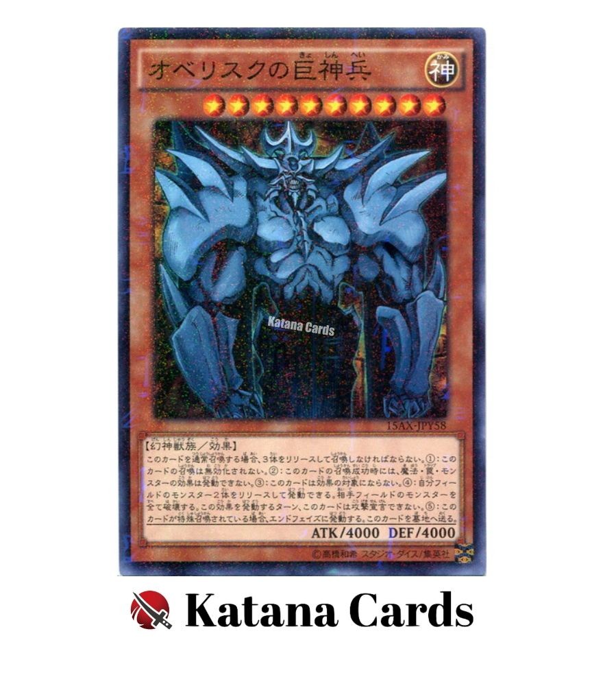 Yugioh Cards | Obelisk the Tormentor Millennium Rare | 15AX-JPY58 Japanese C ondition Near Mint to Excellent Yugioh Cards Check our Yugioh cards here. D iscounts!!! Buy more than 2 cards in my store, Save 3 - 5% off for each cards. Yugioh Cards Check our Yugioh cards here. Discounts are applied automatically by simply adding the product to your cart! If the discount is not applied automatically due to eBay's system error, please inform us of the "Discount Error" in the message after purchasing the item. We will manually apply the discount based on the number of items purchased. S hipping We usually ship within 3 - 5 business days of receiving cleared payment. Economy Shipping - No Tracking Number - It takes 7 - 30 days after shipment. Expedited Shipping - Tracking Number - It takes 3 - 10 days after shipment. If you buy more than 2 cards and choose Expedited Shipping, please select Expedited Shipping for just 1 item. We will ship the items in one package. P ayment We can be contacted at any time through eBay messages if you have any questions, comments or product requests. We will respond to you within 24 hours and do our best to help you out! We encourage our customers to contact us with any questions or concerns! We'd like to be sure you are completely satisfied with your purchase. We do not mark merchandise values below value or mark items as gifts. US and International government regulations prohibit such behavior. I nternational Buyers - Please Note Import duties, taxes, and charges are not included in the item price or shipping cost. These charges are the buyers responsibility. Please check with your country's customs office to determine what these additional costs will be prior to bidding or buying.