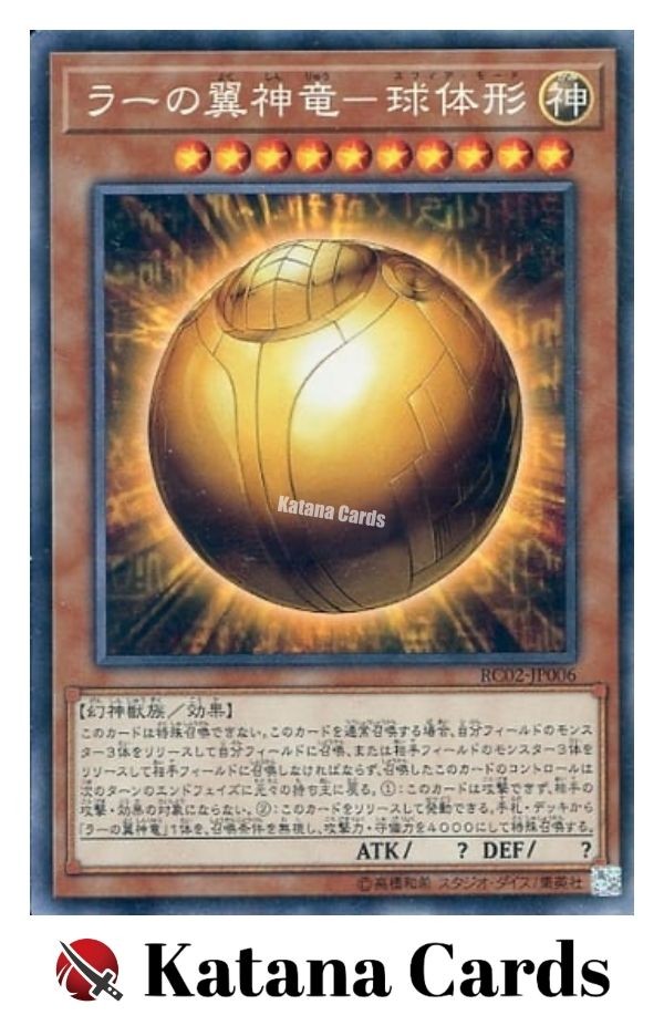 Yugioh Cards | The Winged Dragon of Ra - Sphere Mode Collector's Rare | RC02-JP00 C ondition Near Mint to Excellent Yugioh Cards Check our Yugioh cards here. D iscounts!!! Buy more than 2 cards in my store, Save 3 - 5% off for each cards. Yugioh Cards Check our Yugioh cards here. Discounts are applied automatically by simply adding the product to your cart! If the discount is not applied automatically due to eBay's system error, please inform us of the "Discount Error" in the message after purchasing the item. We will manually apply the discount based on the number of items purchased. S hipping We usually ship within 3 - 5 business days of receiving cleared payment. Economy Shipping - No Tracking Number - It takes 7 - 30 days after shipment. Expedited Shipping - Tracking Number - It takes 3 - 10 days after shipment. If you buy more than 2 cards and choose Expedited Shipping, please select Expedited Shipping for just 1 item. We will ship the items in one package. P ayment We can be contacted at any time through eBay messages if you have any questions, comments or product requests. We will respond to you within 24 hours and do our best to help you out! We encourage our customers to contact us with any questions or concerns! We'd like to be sure you are completely satisfied with your purchase. We do not mark merchandise values below value or mark items as gifts. US and International government regulations prohibit such behavior. I nternational Buyers - Please Note Import duties, taxes, and charges are not included in the item price or shipping cost. These charges are the buyers responsibility. Please check with your country's customs office to determine what these additional costs will be prior to bidding or buying.