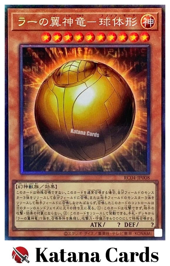 Yugioh Cards | The Winged Dragon of Ra - Sphere Mode Collector's Rare | RC04-JP00 C ondition Near Mint to Excellent Yugioh Cards Check our Yugioh cards here. D iscounts!!! Buy more than 2 cards in my store, Save 3 - 5% off for each cards. Yugioh Cards Check our Yugioh cards here. Discounts are applied automatically by simply adding the product to your cart! If the discount is not applied automatically due to eBay's system error, please inform us of the "Discount Error" in the message after purchasing the item. We will manually apply the discount based on the number of items purchased. S hipping We usually ship within 3 - 5 business days of receiving cleared payment. Economy Shipping - No Tracking Number - It takes 7 - 30 days after shipment. Expedited Shipping - Tracking Number - It takes 3 - 10 days after shipment. If you buy more than 2 cards and choose Expedited Shipping, please select Expedited Shipping for just 1 item. We will ship the items in one package. P ayment We can be contacted at any time through eBay messages if you have any questions, comments or product requests. We will respond to you within 24 hours and do our best to help you out! We encourage our customers to contact us with any questions or concerns! We'd like to be sure you are completely satisfied with your purchase. We do not mark merchandise values below value or mark items as gifts. US and International government regulations prohibit such behavior. I nternational Buyers - Please Note Import duties, taxes, and charges are not included in the item price or shipping cost. These charges are the buyers responsibility. Please check with your country's customs office to determine what these additional costs will be prior to bidding or buying.