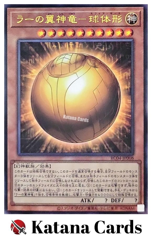Yugioh Cards | The Winged Dragon of Ra - Sphere Mode Ultimate Rare | RC04-JP008 J C ondition Near Mint to Excellent Yugioh Cards Check our Yugioh cards here. D iscounts!!! Buy more than 2 cards in my store, Save 3 - 5% off for each cards. Yugioh Cards Check our Yugioh cards here. Discounts are applied automatically by simply adding the product to your cart! If the discount is not applied automatically due to eBay's system error, please inform us of the "Discount Error" in the message after purchasing the item. We will manually apply the discount based on the number of items purchased. S hipping We usually ship within 3 - 5 business days of receiving cleared payment. Economy Shipping - No Tracking Number - It takes 7 - 30 days after shipment. Expedited Shipping - Tracking Number - It takes 3 - 10 days after shipment. If you buy more than 2 cards and choose Expedited Shipping, please select Expedited Shipping for just 1 item. We will ship the items in one package. P ayment We can be contacted at any time through eBay messages if you have any questions, comments or product requests. We will respond to you within 24 hours and do our best to help you out! We encourage our customers to contact us with any questions or concerns! We'd like to be sure you are completely satisfied with your purchase. We do not mark merchandise values below value or mark items as gifts. US and International government regulations prohibit such behavior. I nternational Buyers - Please Note Import duties, taxes, and charges are not included in the item price or shipping cost. These charges are the buyers responsibility. Please check with your country's customs office to determine what these additional costs will be prior to bidding or buying.
