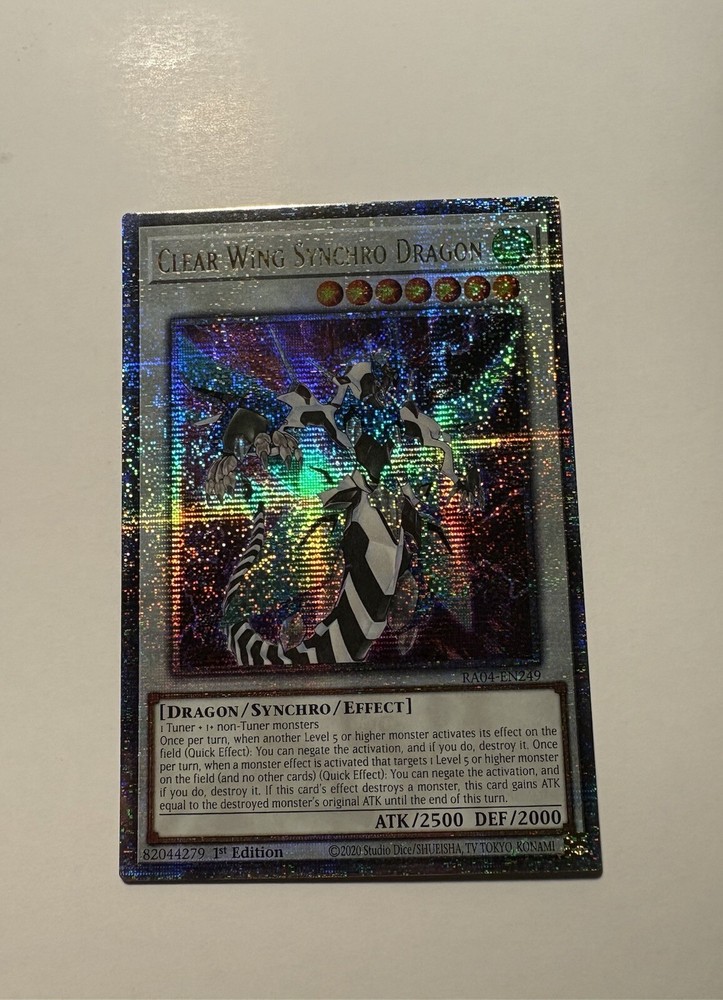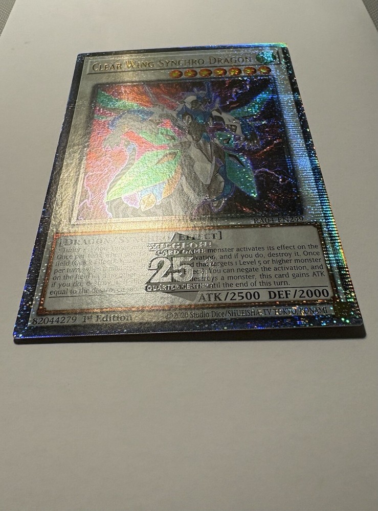 Elevate your Yu-Gi-Oh! TCG collection with the majestic Clear Wing Synchro Dragon from the Quarter Century Stampede set. This card, featuring the enigmatic Crystal, is a must-have for both players and collectors alike, as it brings a touch of strategic depth to the game with its unique Dragon creature/monster type. The foil finish captures the essence of this powerful card, making it a standout addition to any deck or display. Crafted by Konami, the Clear Wing Synchro Dragon card is produced in the United States and boasts the 1st Edition feature, signifying its value as a collectible. Its card stock material ensures durability, while its crisp detailing and design reflect the quality that players and collectors have come to expect from the Yu-Gi-Oh! TCG series. Add this iconic card to your collection and watch your opponents marvel at its might.