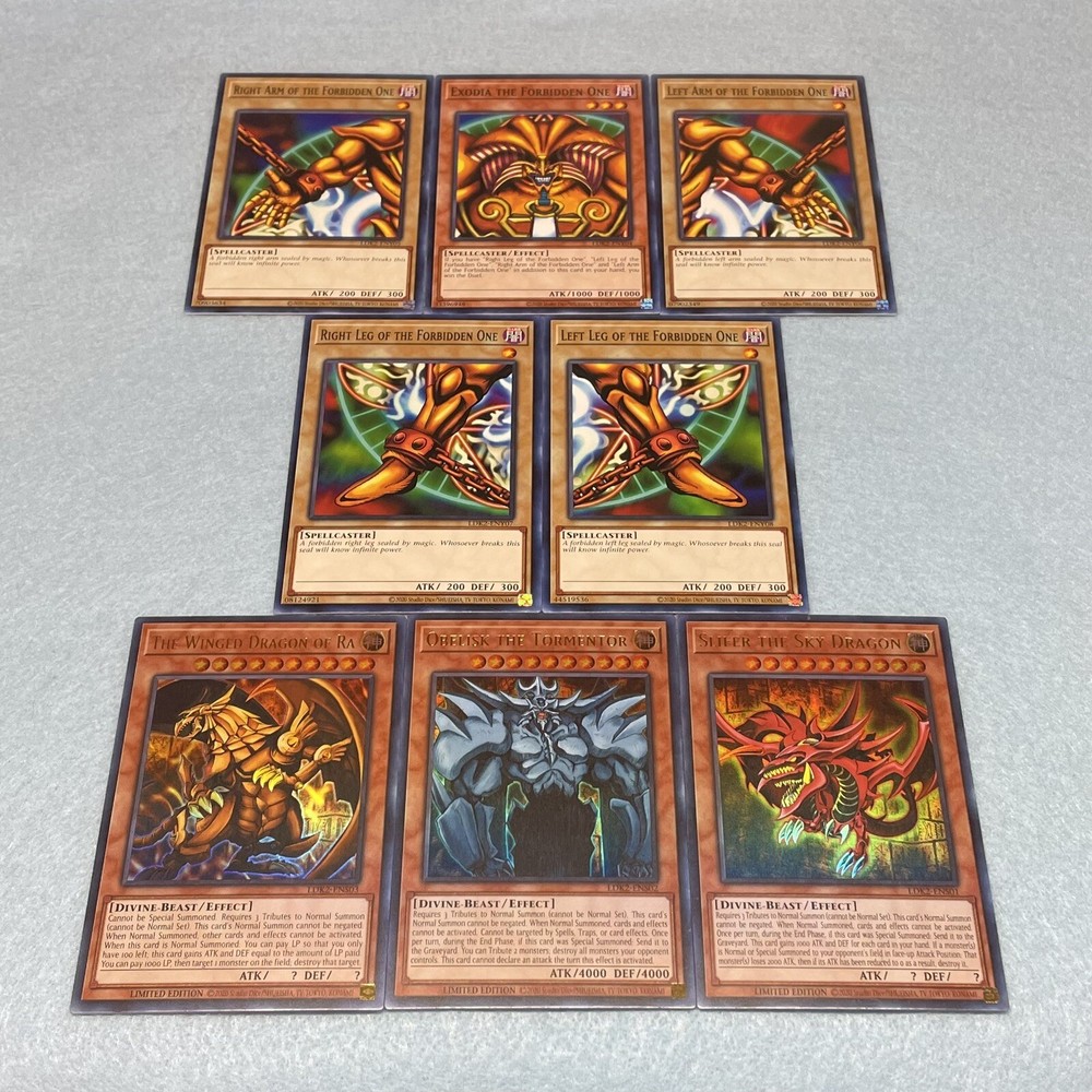 You will receive all eight cards pictured. The Winged Dragon of Ra (Ultra Rare) Slifer the Sky Dragon (Ultra Rare) Obelisk the Tormentor (Ultra Rare) Exodia the Forbidden One Right Arm of the Forbidden One Left Arm of the Forbidden One Right Leg of the Forbidden One Left Leg of the Forbidden One All cards are authentic and in near-mint condition. The Egyptian god cards are the tournament-legal versions.