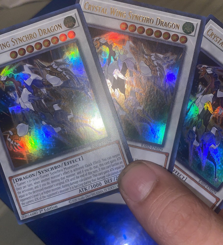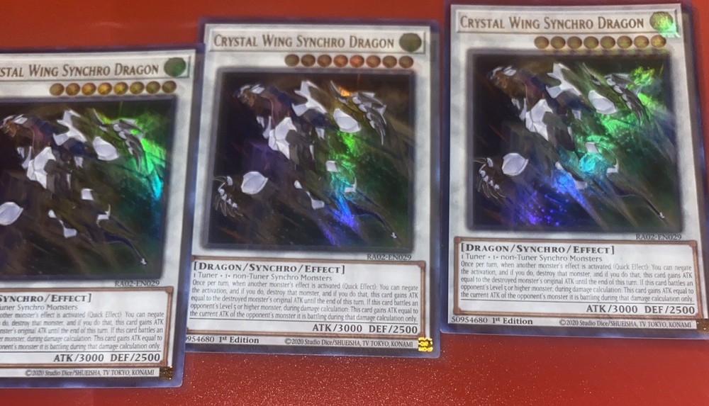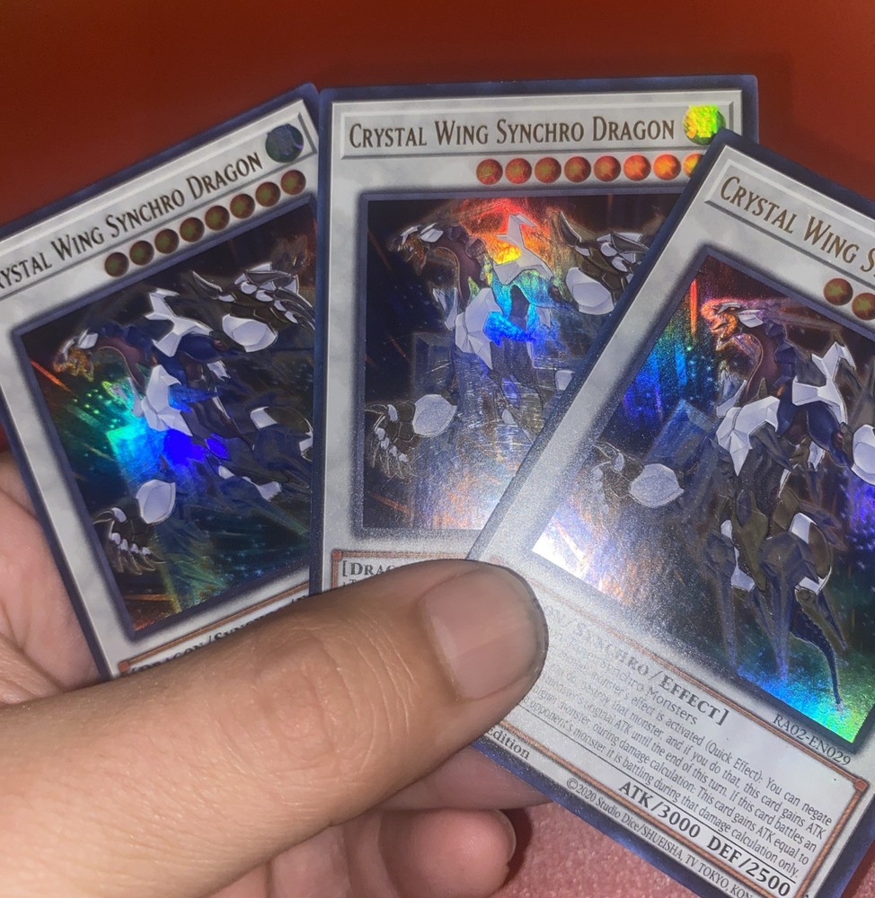 This is for 1 copy of clear wing synchro dragon But there is 3 available All single cards are shipped next day . And shipped with a standard envelope label so it does have tracking all come with some free cards always random Product Details 1 Tuner + 1+ non-Tuner Synchro Monsters Once per turn, when another monster's effect is activated (Quick Effect): You can negate the activation, and if you do, destroy that monster, and if you do that, this card gains ATK equal to the destroyed monster's original ATK until the end of this turn. If this card battles an opponent's Level 5 or higher monster, during damage calculation: This card gains ATK equal to the current ATK of the opponent's monster it is battling during that damage calculation only. Number:RA02-EN029 Rarity:Ultra Rare Attribute Monster Type/Card Type:WIND Dragon/Synchro/Effect Monster Level:8 A / D:3000 / 2500