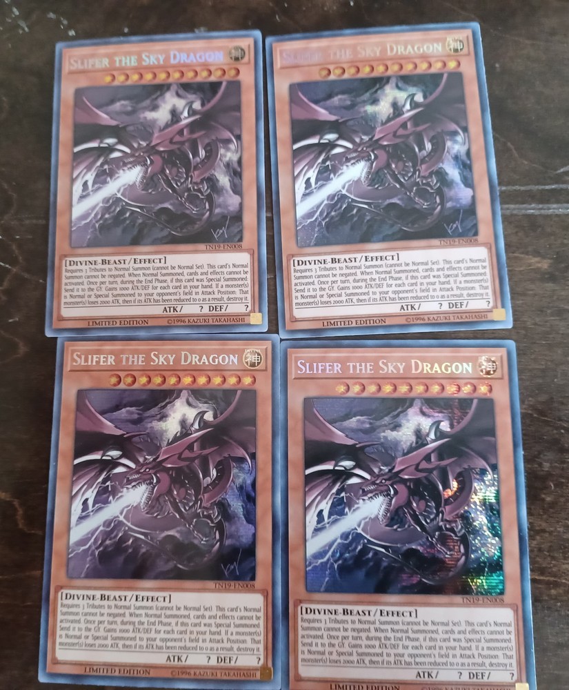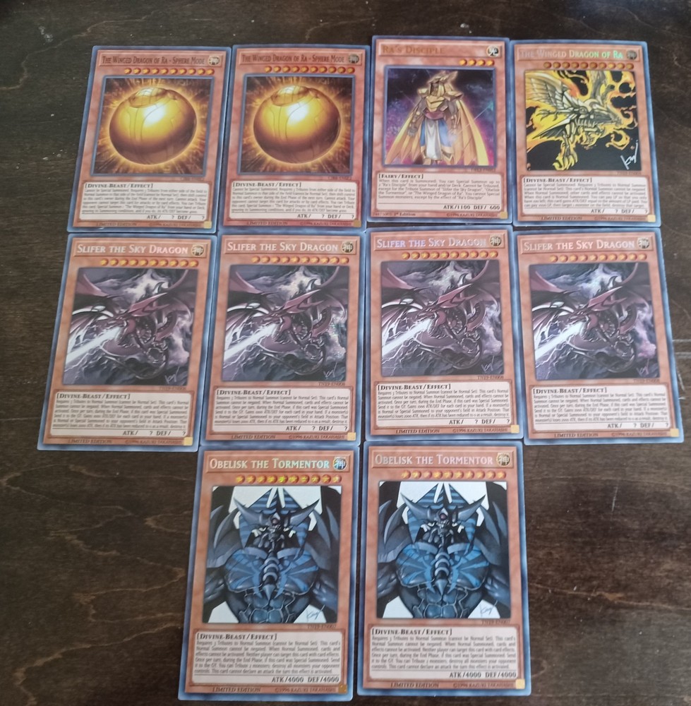 RA'S DISCIPLE (ULTRA RARE), THE WINGED DRAGON OF RA-SPHERE MODE X2 (SUPER RARE), THE WINGED DRAGON OF RA (PRISMATIC SECRET RARE), SLIFER THE SKY DRAGON X4 ( PRISMATIC SECRET RARE), AND OBELISK THE TORMENTOR X2 ( PRISMATIC SECRET RARE)